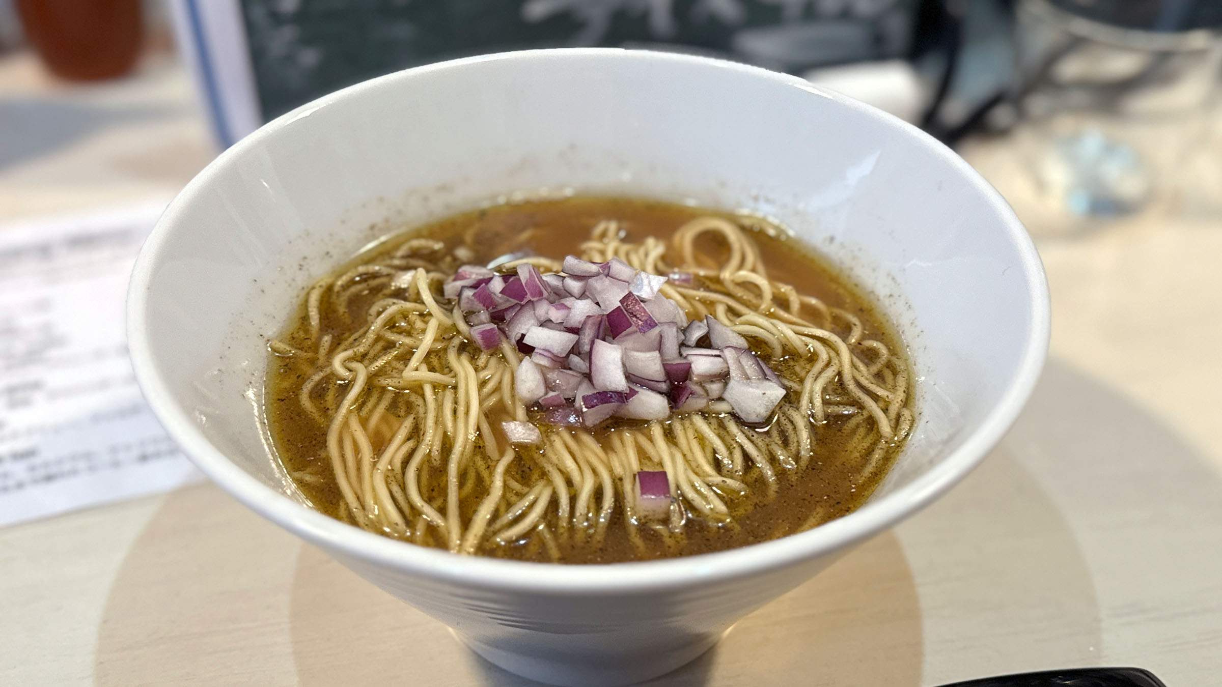 煮干しの旨味をシンプルに味わうために、ラーメンのトッピングは紫玉ねぎのみ。見た目はかなりシンプルでもスープは濃厚で、永井さんこだわりの”煮干し感”を存分に味わえる一品です。