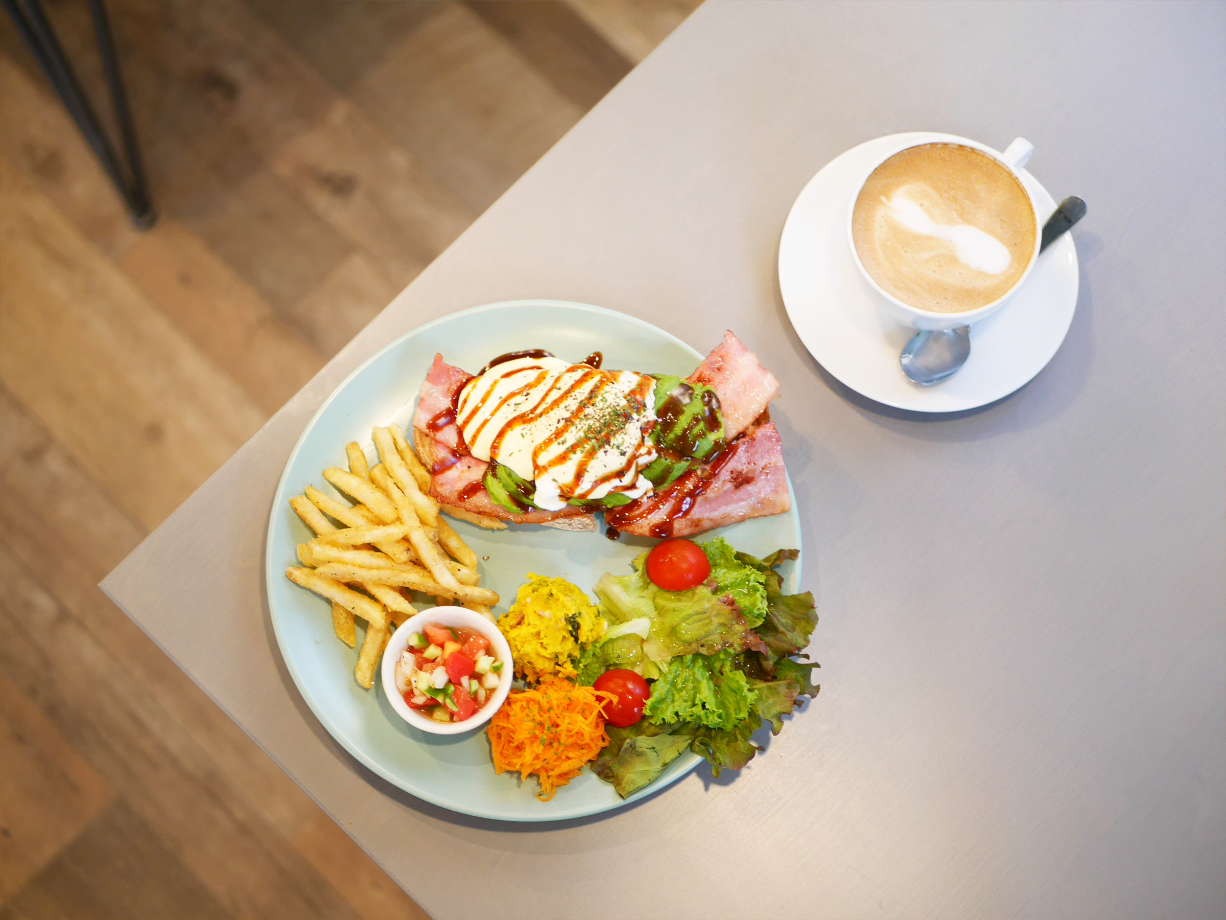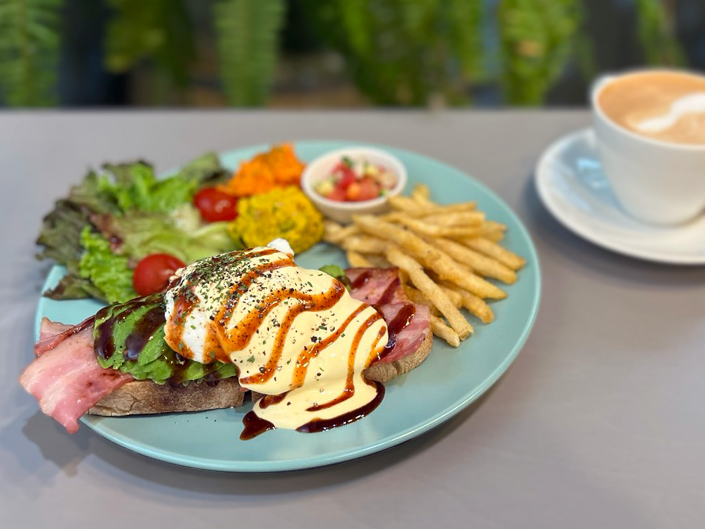 まるで海外リゾートのテラス席にいるような雰囲気の中で味わう特製エッグベネディクトは、わざわざ足を運びたくなる特別なランチ。緑と料理、両方の魅力に心満たされるひとときが広がります。