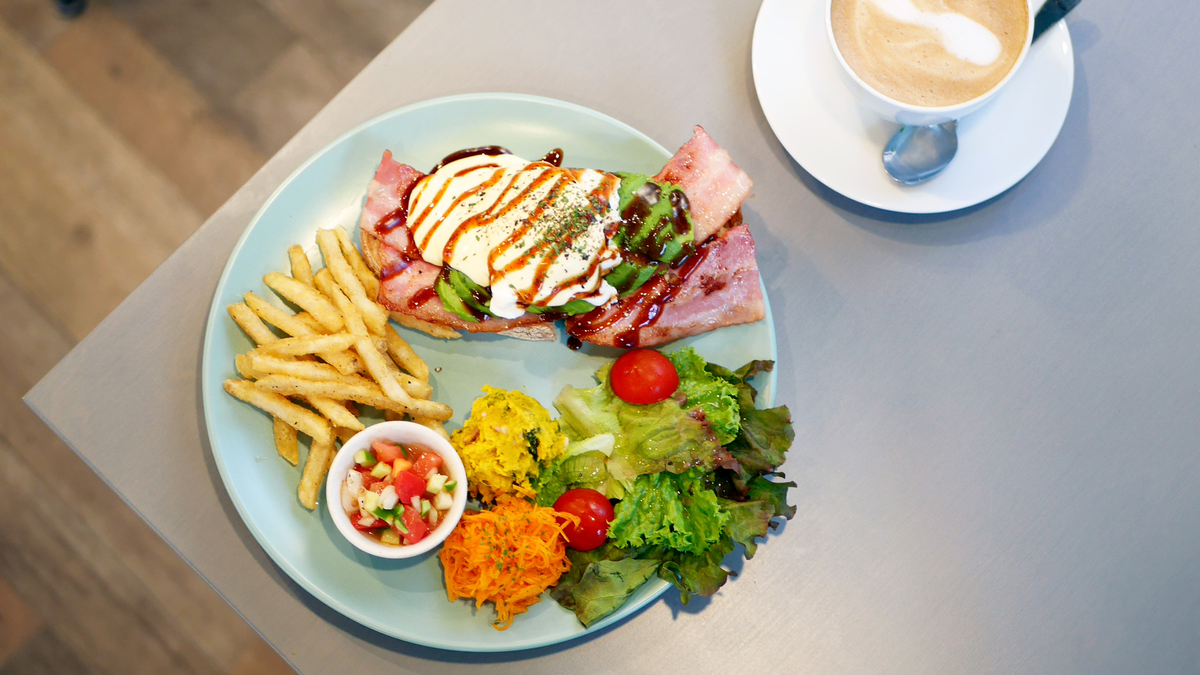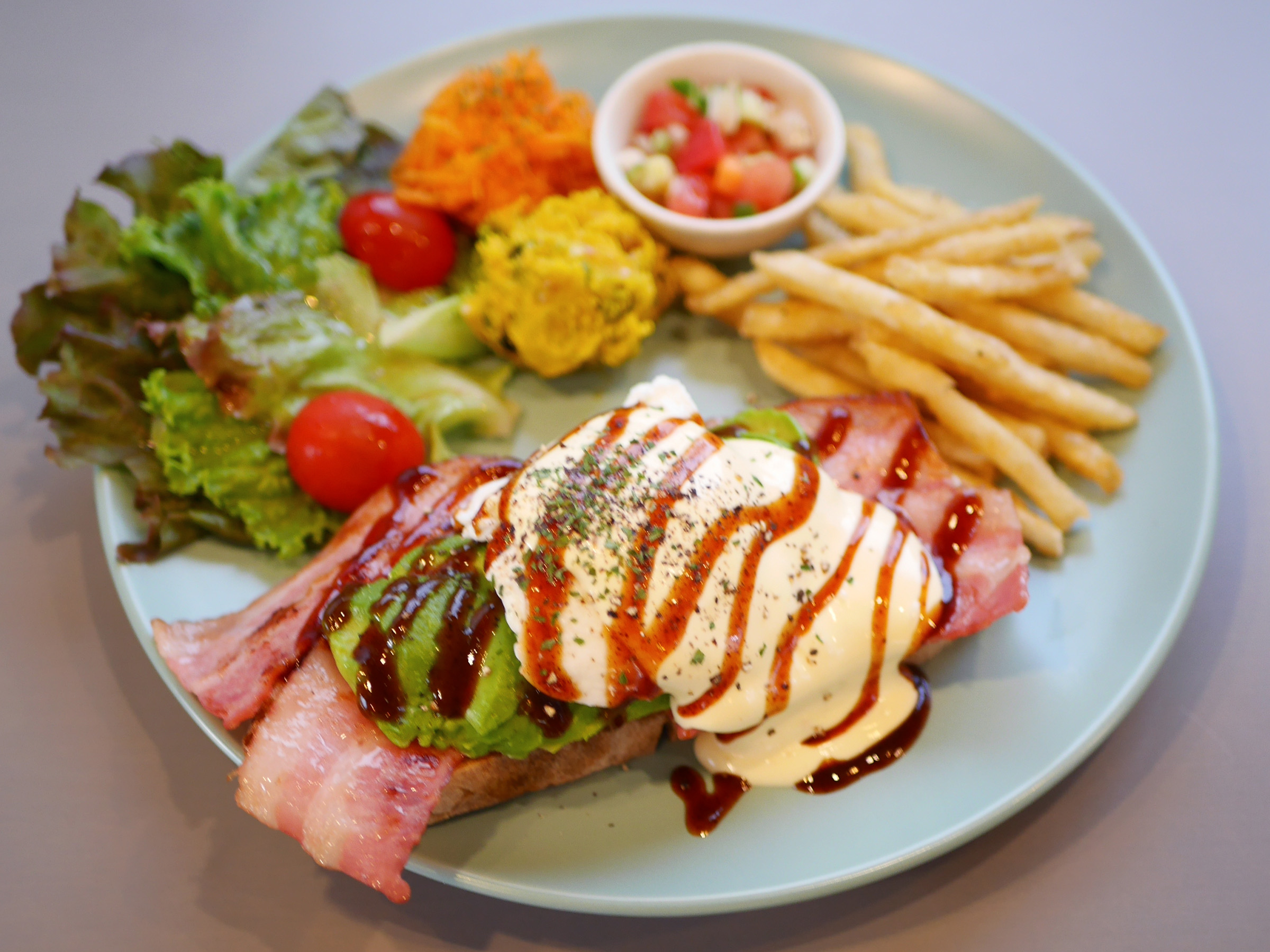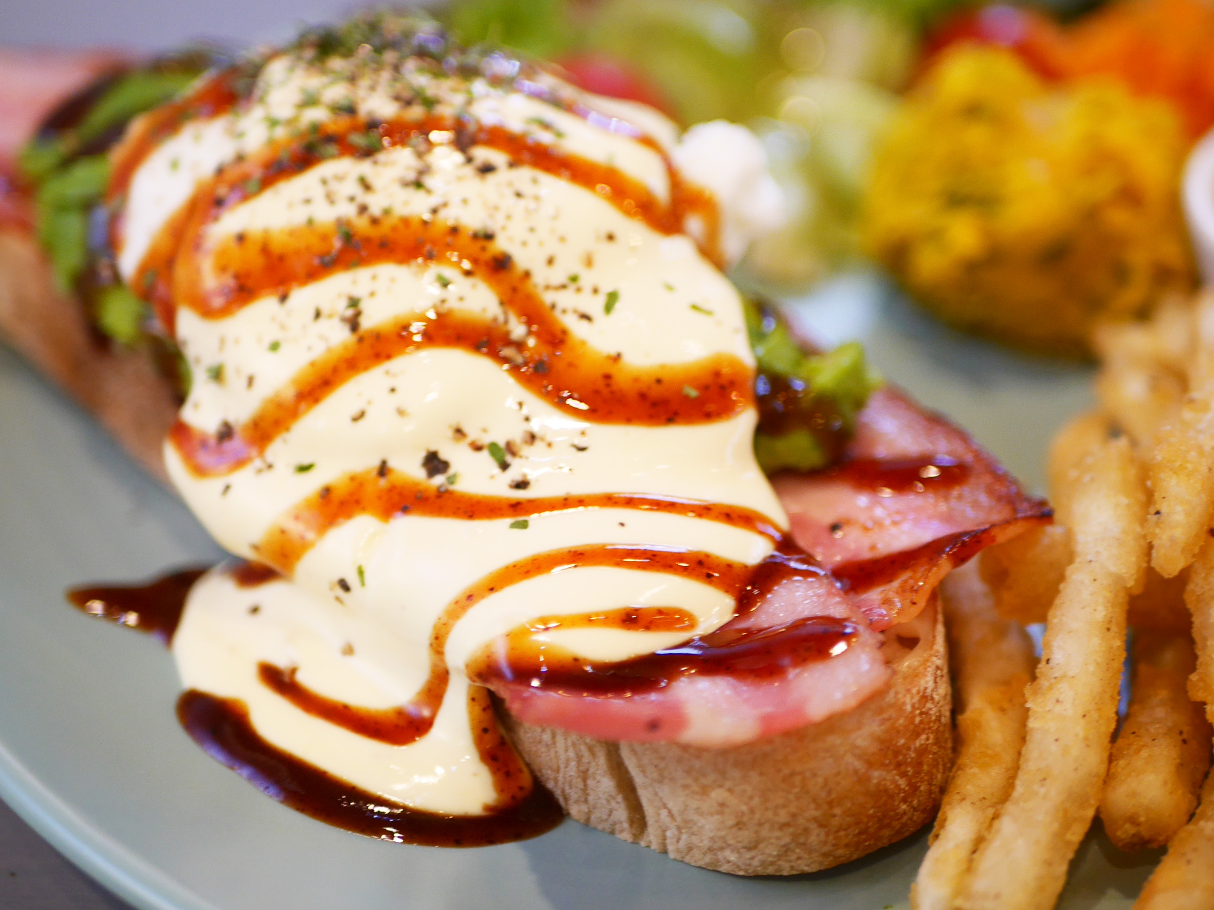 ベーコン、アボカド、とろとろのポーチドエッグに、自家製オランデーズソースを合わせます。濃厚なコクと爽やかな酸味のバランスが絶妙で、酸味を効かせたマヨネーズを隠し味に風味を調え、さらに特製BBQソースが甘みとスモーキーさを添えます。