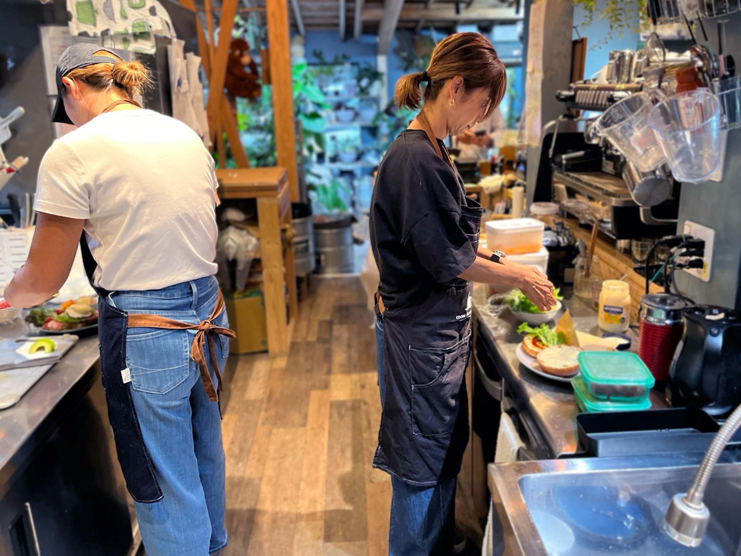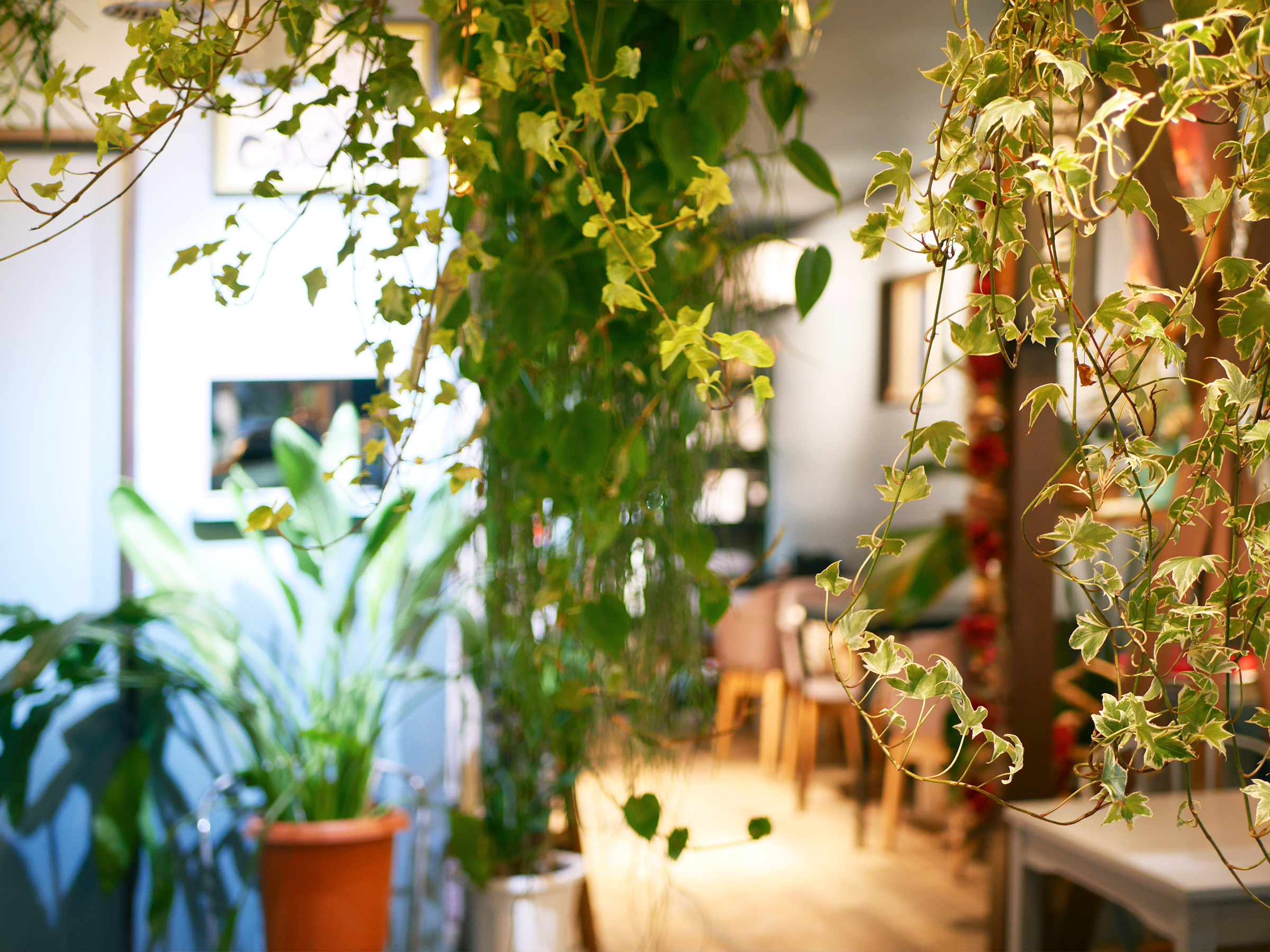 カフェには地元のほか逗子・葉山・横浜からも多くの女性客やママ友が訪れ、外国人にも人気。観葉植物に囲まれた空間はインテリアの参考になると好評です。