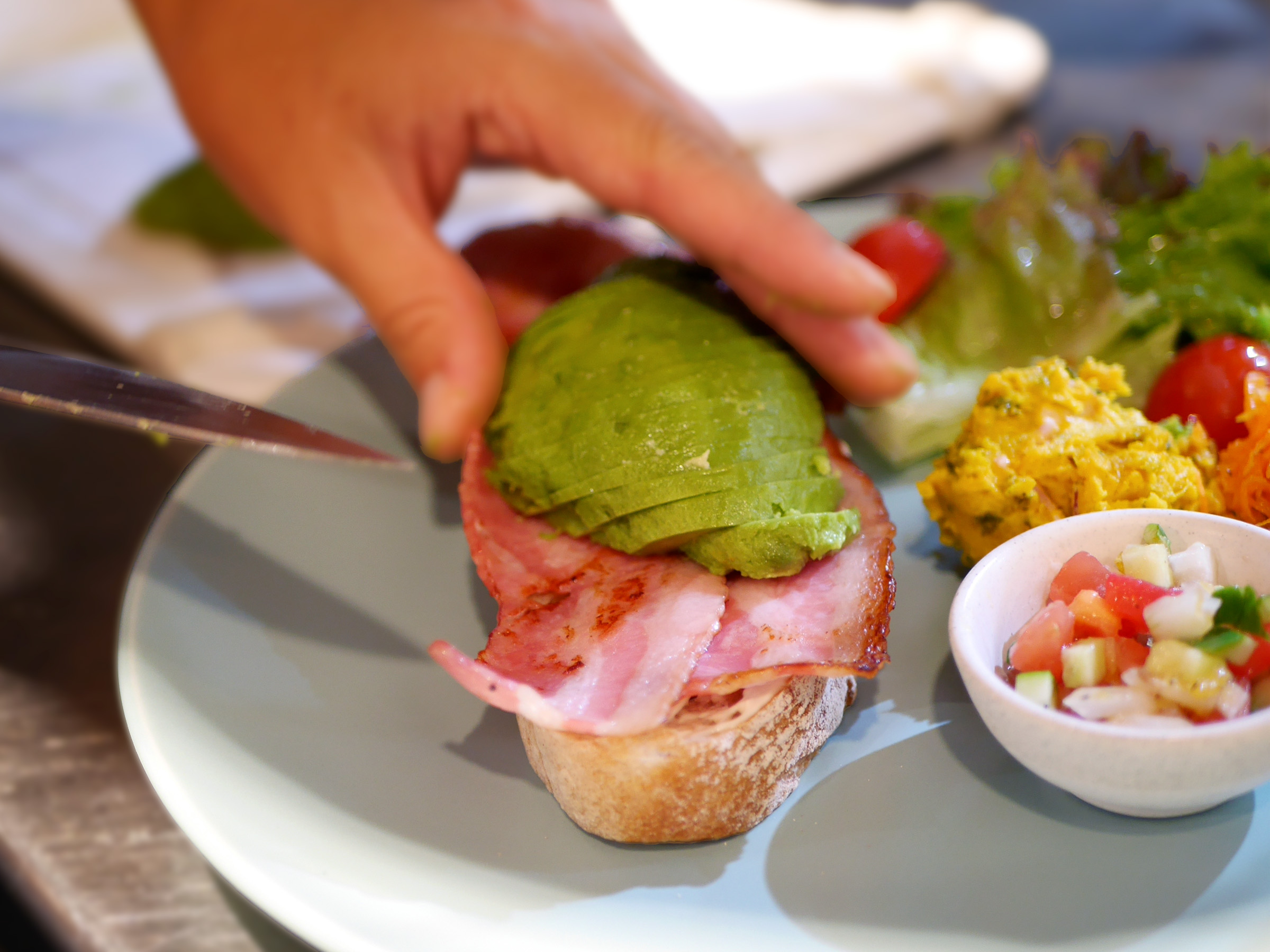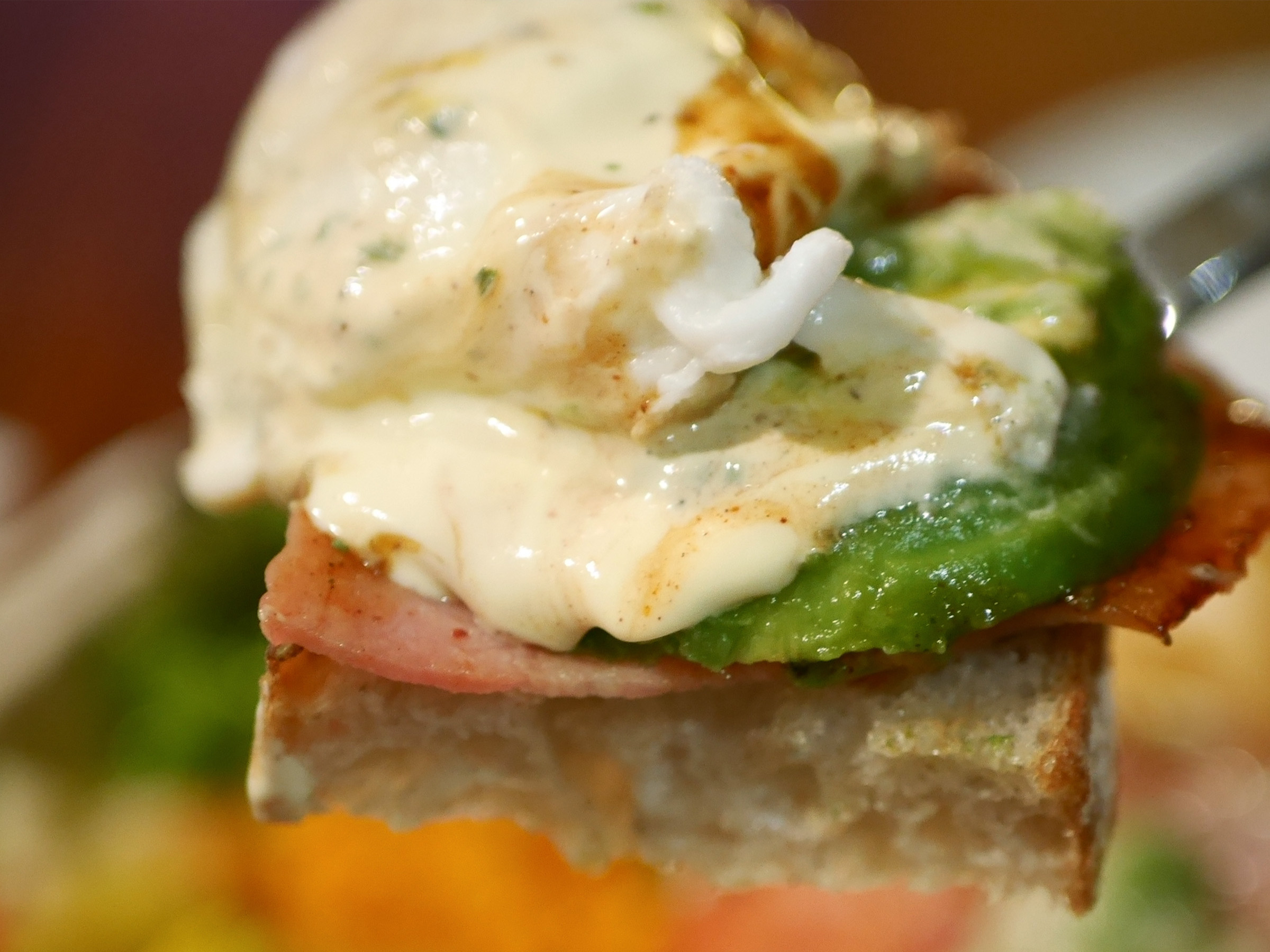 ナイフを入れると、とろりと黄身が溢れ、厚切りベーコンの香ばしさとアボカドのクリーミーさ、とろりとした濃厚なオランデーズソースが重なり合う——。