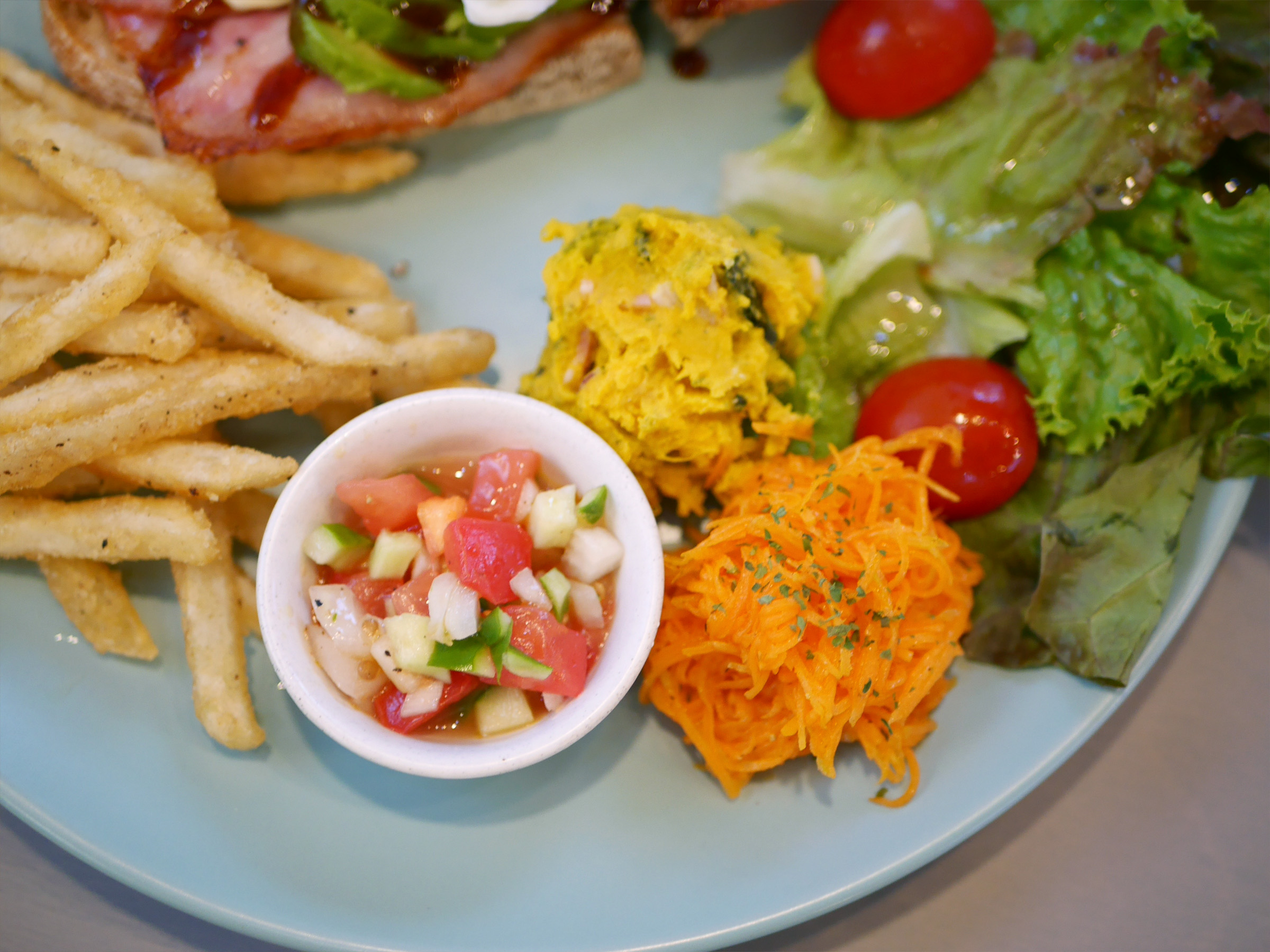 エッグベネディクトにはレタスやトマト、かぼちゃのサラダ、キャロットラペ、スパイスの効いたカチュンバルサラダ、フライドポテトなど多彩な野菜を添え、彩り豊かで満足感あるプレート仕立て。栄養バランスと華やかさも人気の理由です。
