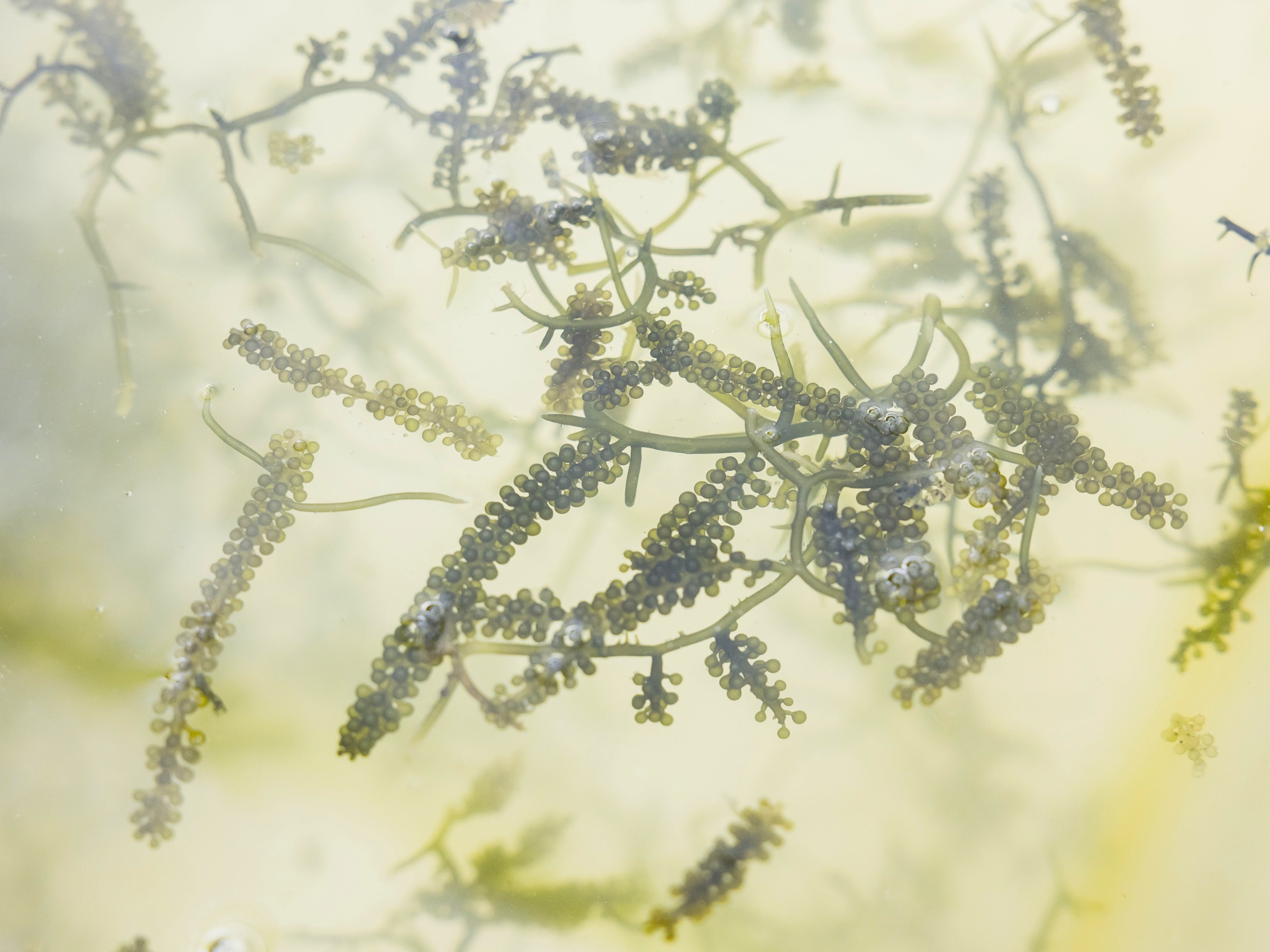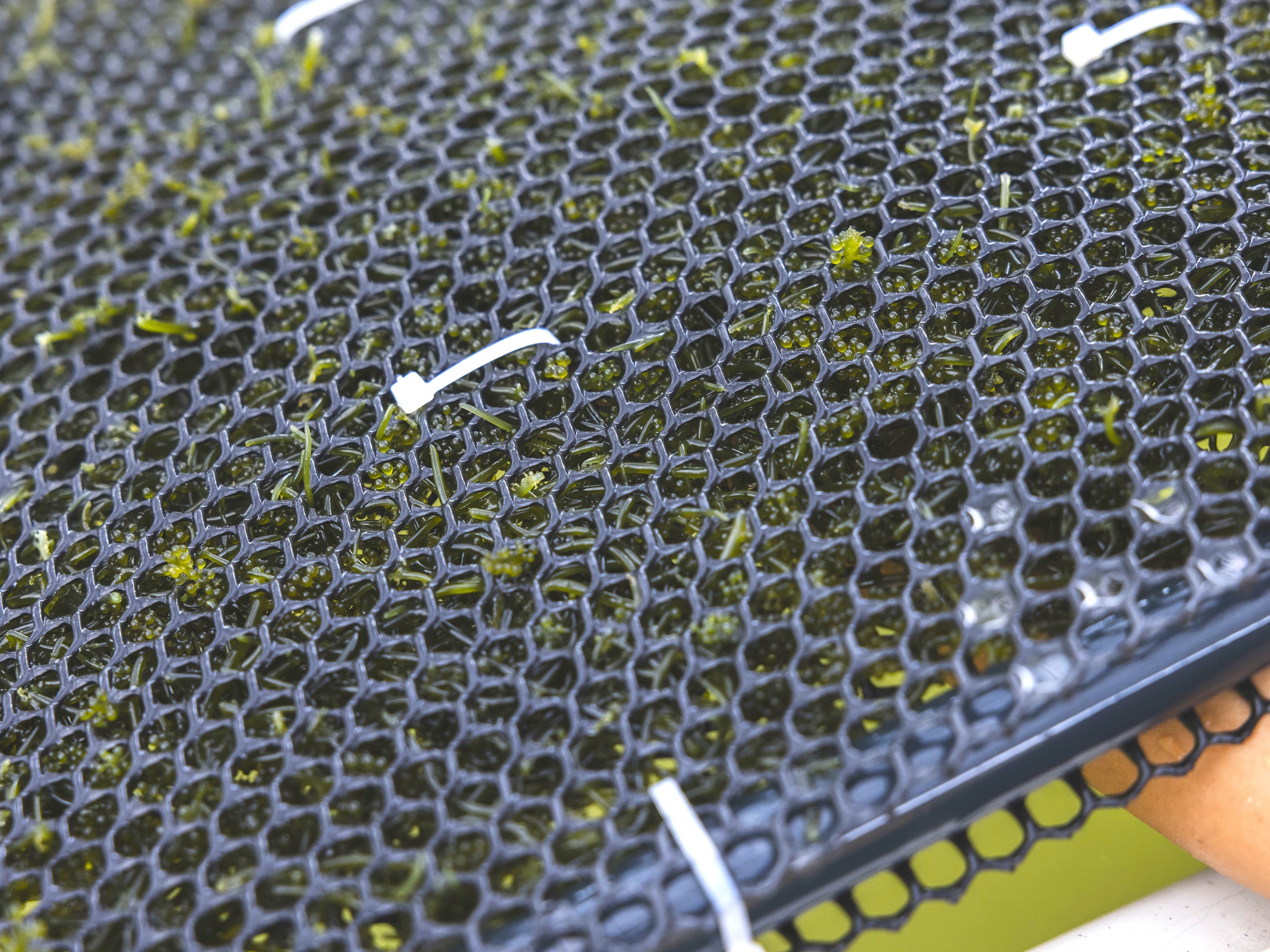 宮古島から仕入れた海ぶどうの母藻(種苗)は、水槽内でミネラルを多く含む走水の海水で掛け流すことで、栄養をたっぷり蓄えて育ちます。取材当日は2025年第一弾として4つの養殖ネットに苗を定植したばかりで、味見はおあずけに。