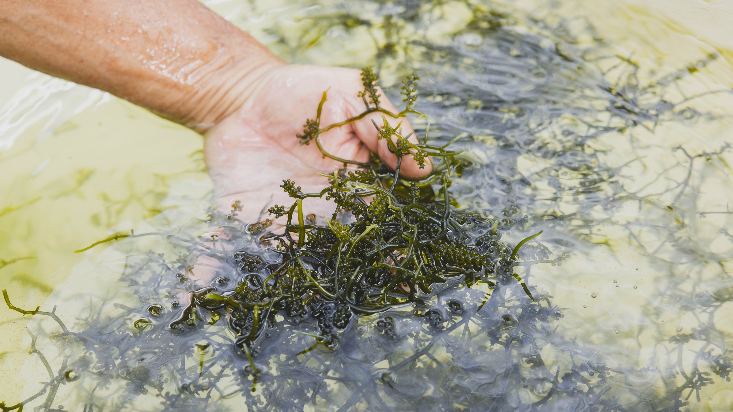 「今年は母藻の育ちも良いみたいです。海藻はその場にしか根を張れないため、足場を安定させないと肝心な房の“成長スイッチ”が入らず、茎ばかり伸びてしまいます。だからプリプリの海ぶどうにするには、ネットは底から浮かばないように石を入れておくことが重要」(明加里さん)