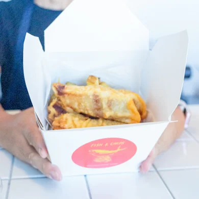 木・金・土曜日のみの営業ですが、早朝からひっきりなしにお客さんが訪れていました。お目当ては揚げたてのフィッシュ&チップス。イギリスが本場の魚のフライとポテトフライの組み合わせです。