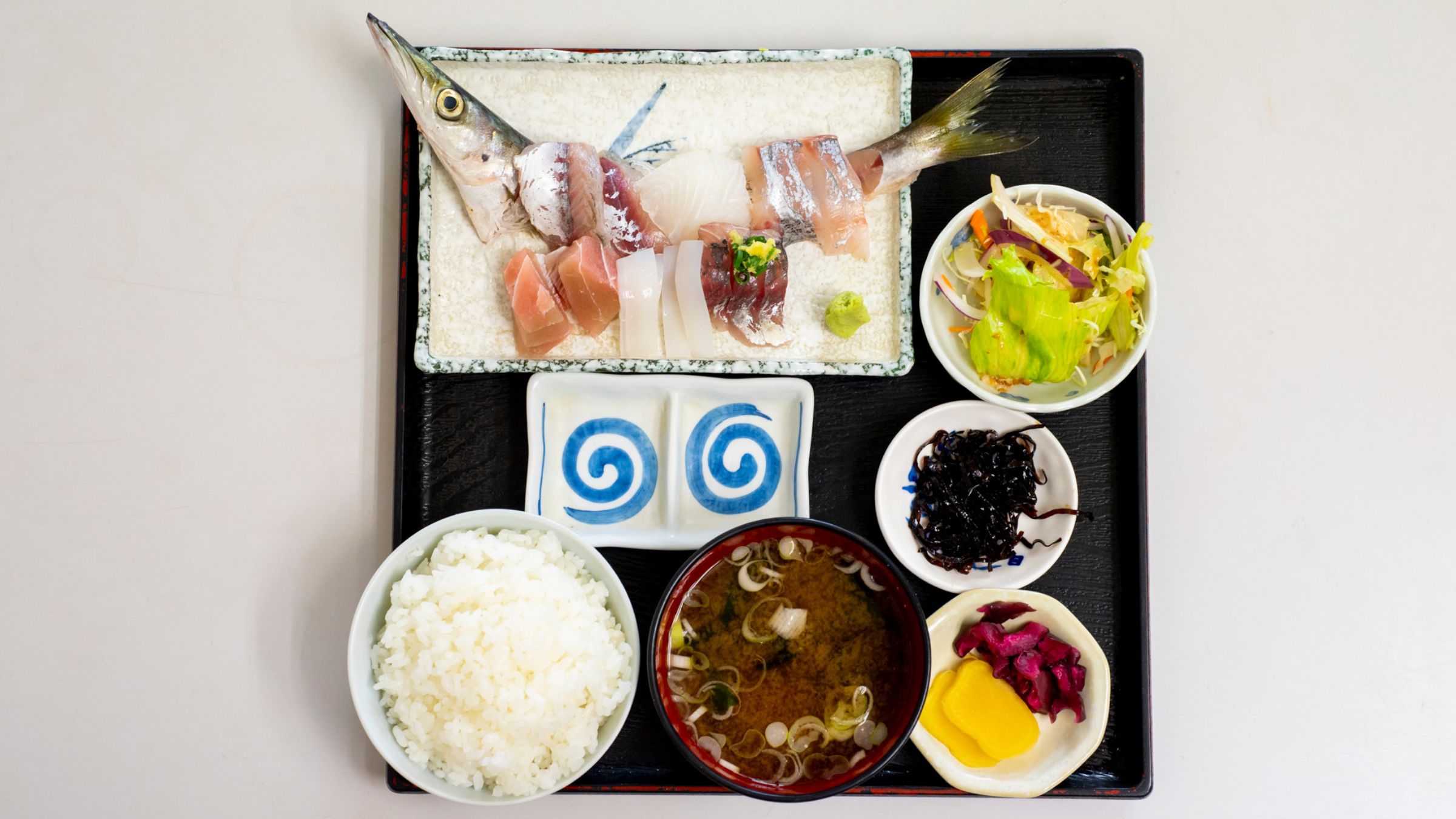 この日はマグロ、タチウオ、イカ、アジ、カマスと5種類。定食で1000円、単品で700円という手頃な価格で提供されており、定食にするとご飯のおかわりは1杯無料です。