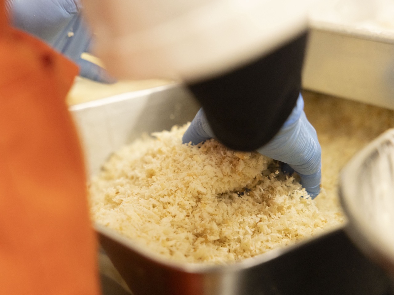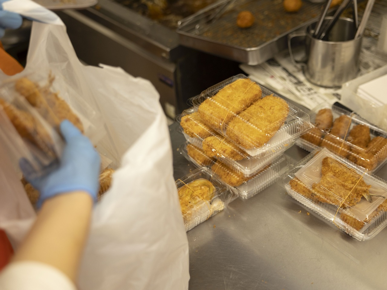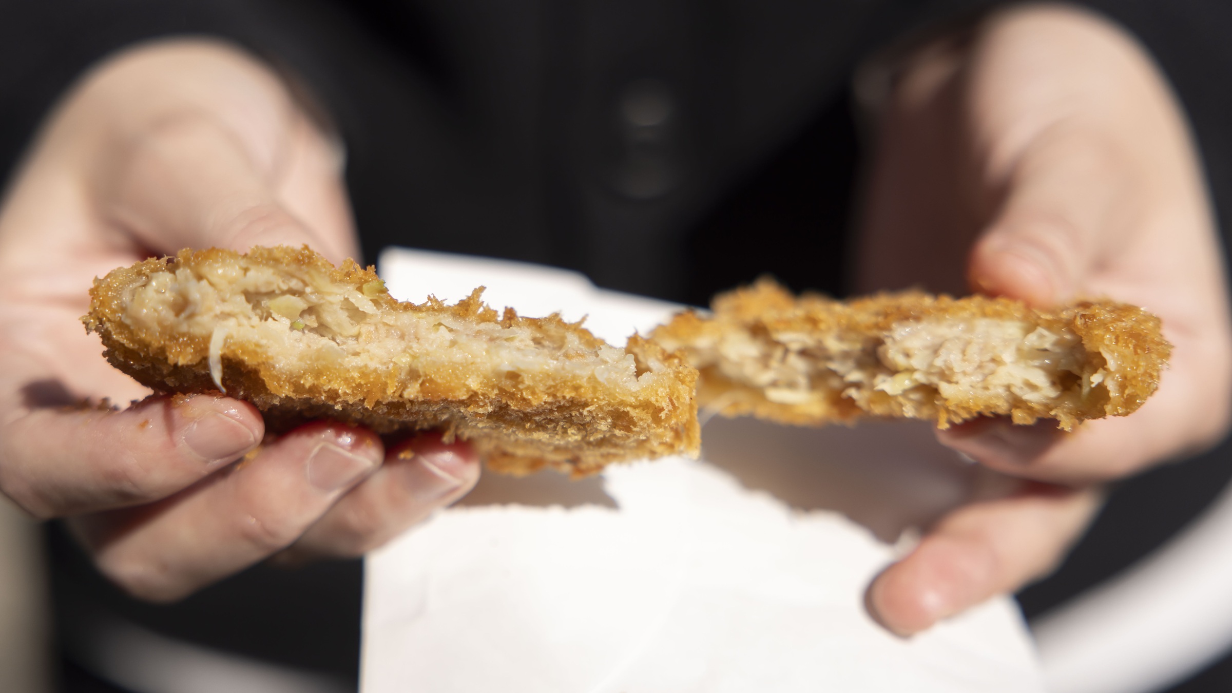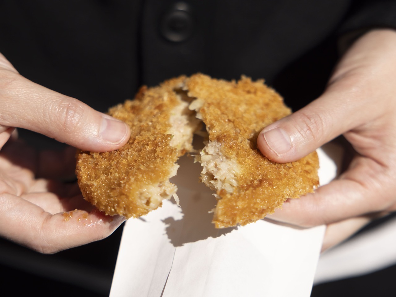 メンチカツを頬張ってみると、口の中で甘い肉汁がじゅわっと広がってジューシー! 豚肉、玉ねぎ、キャベツの3つの味わいが際立つように、砂糖や塩でシンプルに味付けしているのだとか。