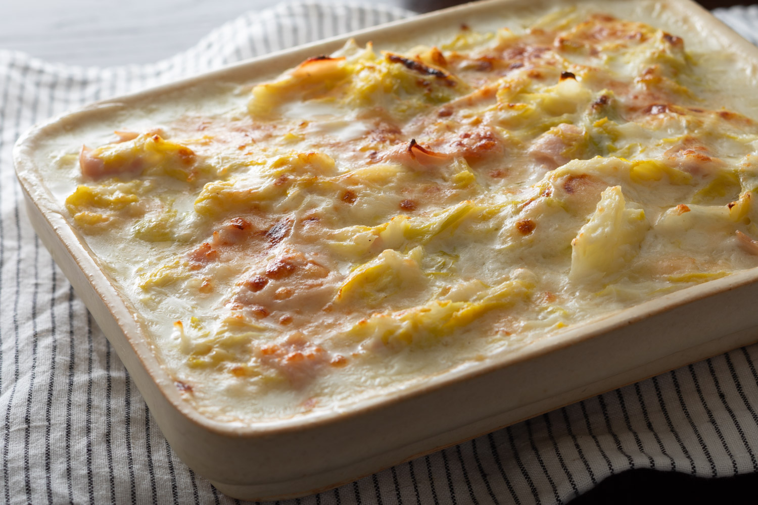 ホワイトソースにキャベツの蒸し汁を入れるのは、春キャベツの甘みや柔らかさを生かした、軽い食感のグラタンにするためです。本春キャベツの蒸し汁は甘くて美味しいので、ぜひ使ってみてください