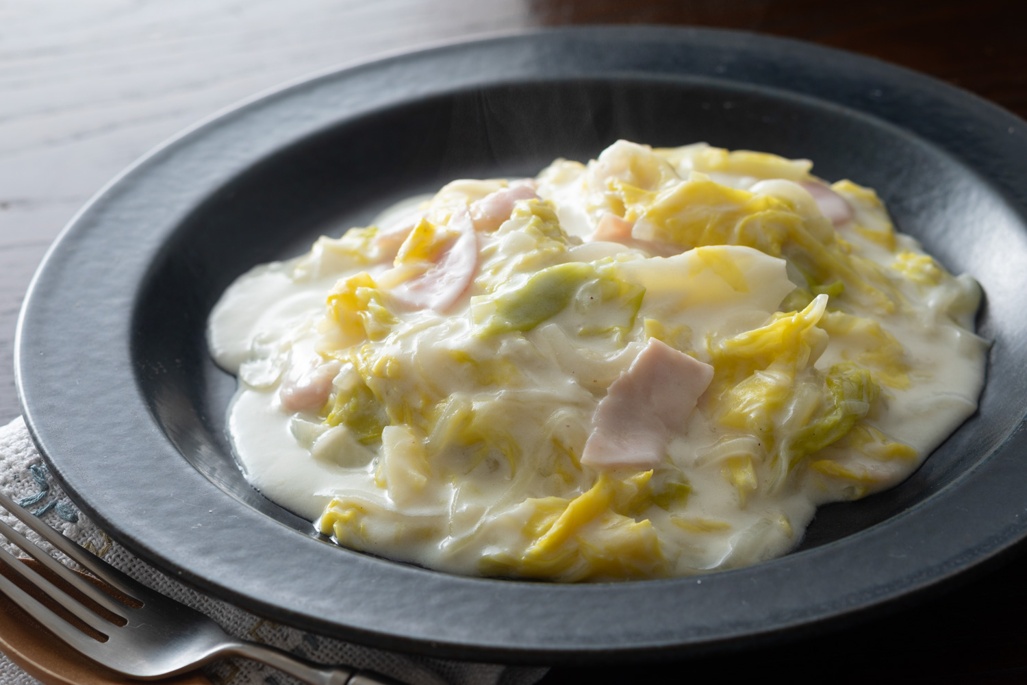 キャベツを先に少し蒸し煮にしておくと、ホワイトソースとのなじみがよくなり、ぐつぐつ煮ることなく、すぐにとろりとしたクリーム煮になります。