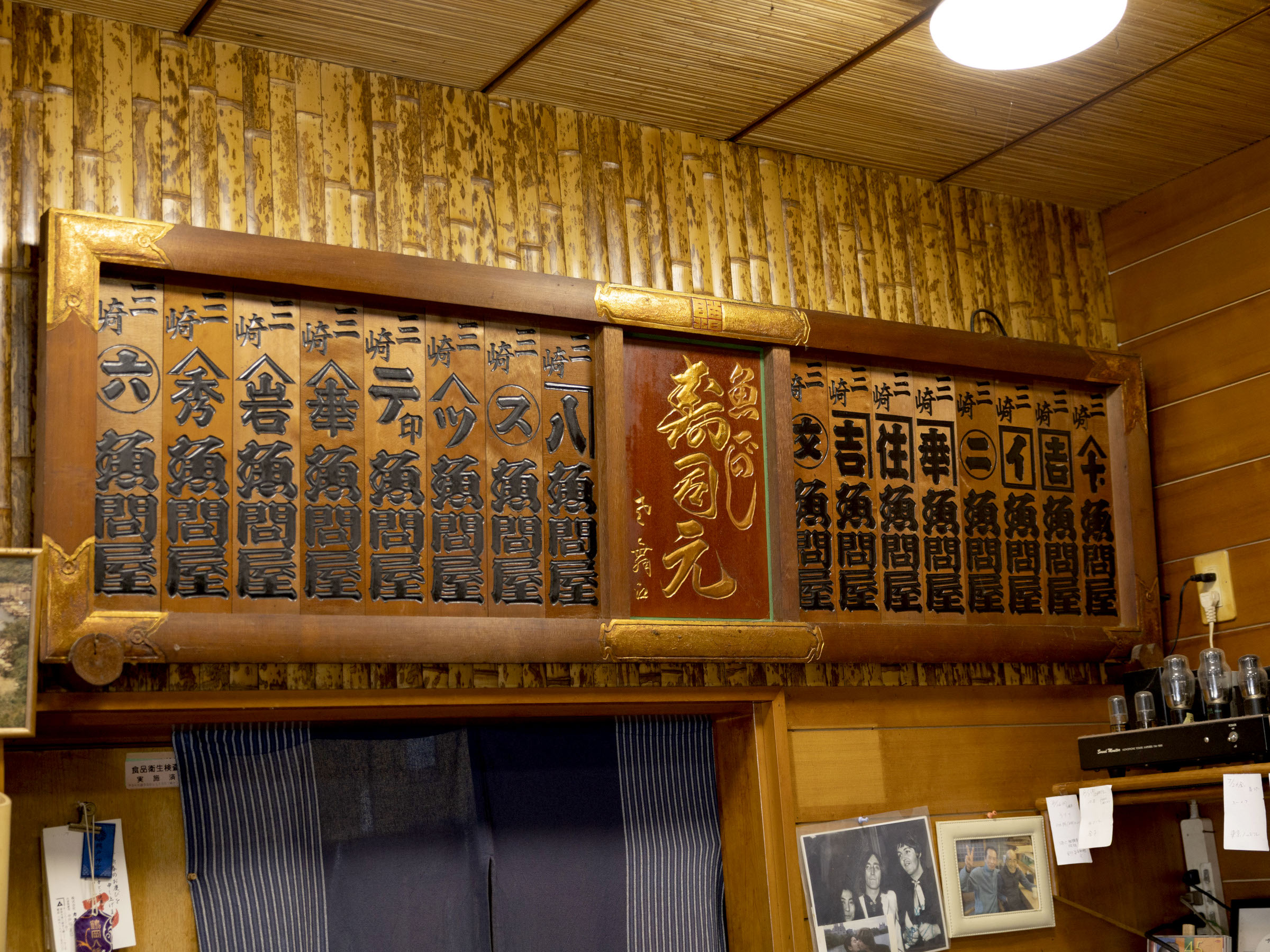 斉藤さんは、元マグロ問屋だったという先代から受け継いだ二代目。カウンターの後ろに掲げられた立派な千社額には、先代の歴史が詰まっていました。