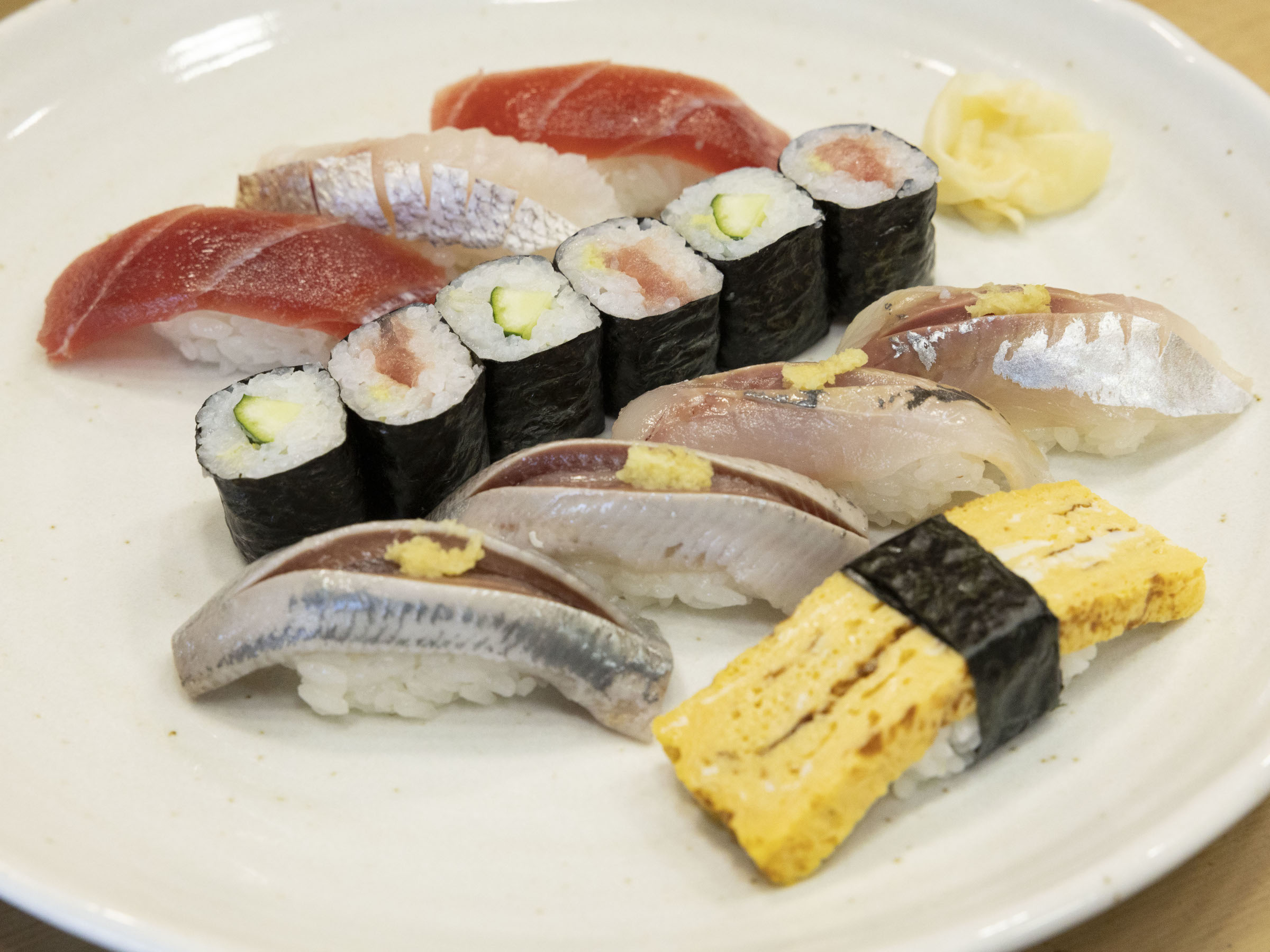 暖簾をくぐると、昔ながらの寿司屋の風情がありながら、店内にはジャズが楽しげに流れています。ハット姿の大将・斉藤哲夫さんがカウンター越しに握ってくれたのは、鮮やかな赤身が目を惹く「まぐろ寿司」(1,100円・税込)でした。