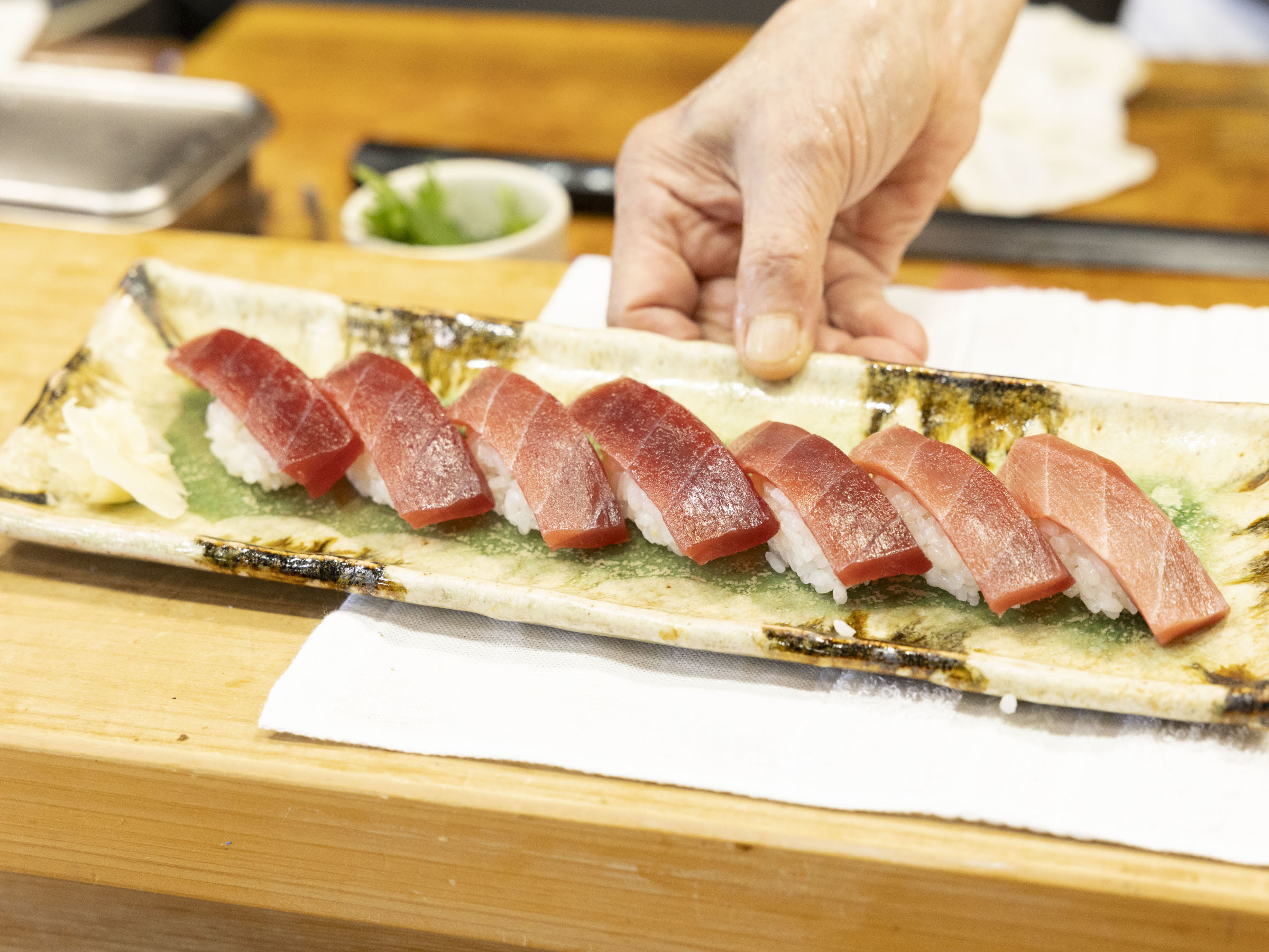 「シャリは季節でお米の品種を変え、ほどよいほぐれと口どけにこだわっています。寿司ネタとお米との相性の良し悪しは、握りやすさでわかります。握りやすいお米は、食べやすいお米。新米の時期はササニシキを選ぶことが多いですね」
