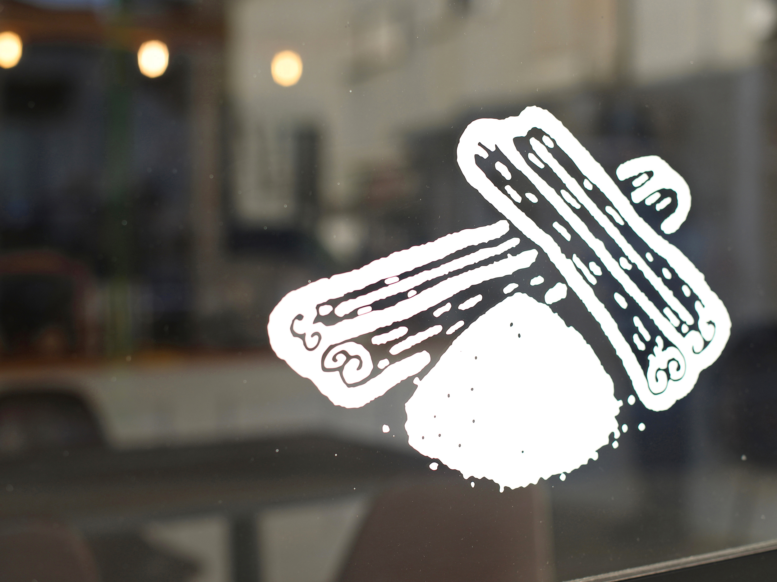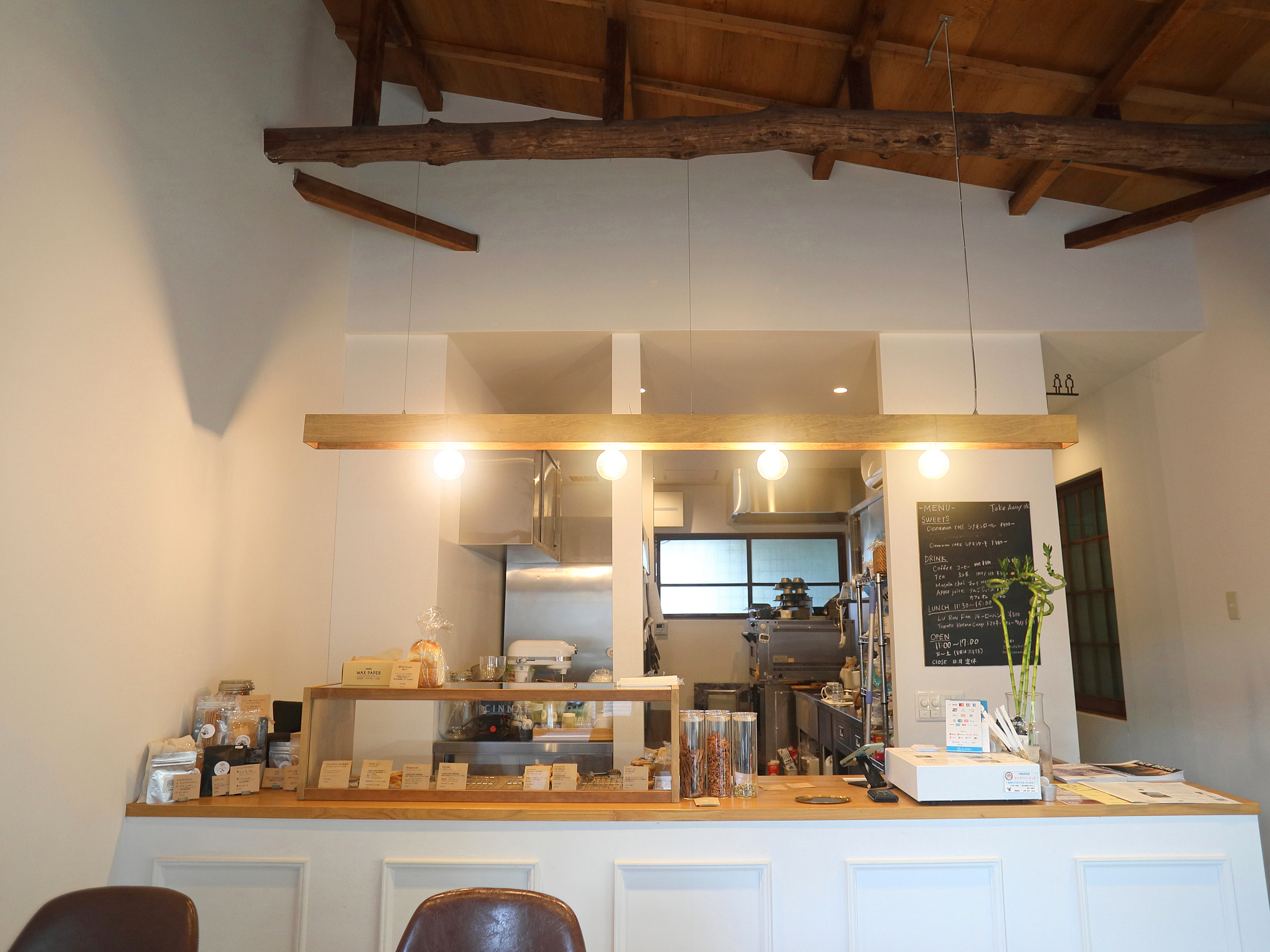 「クルクルシナモン」がある通りは、かつては賑やかな商店街でした。黒を基調としたシックな外観が印象的な建物は、もとは八百屋さんだったそう。天井の梁はそのままの姿を残しています。