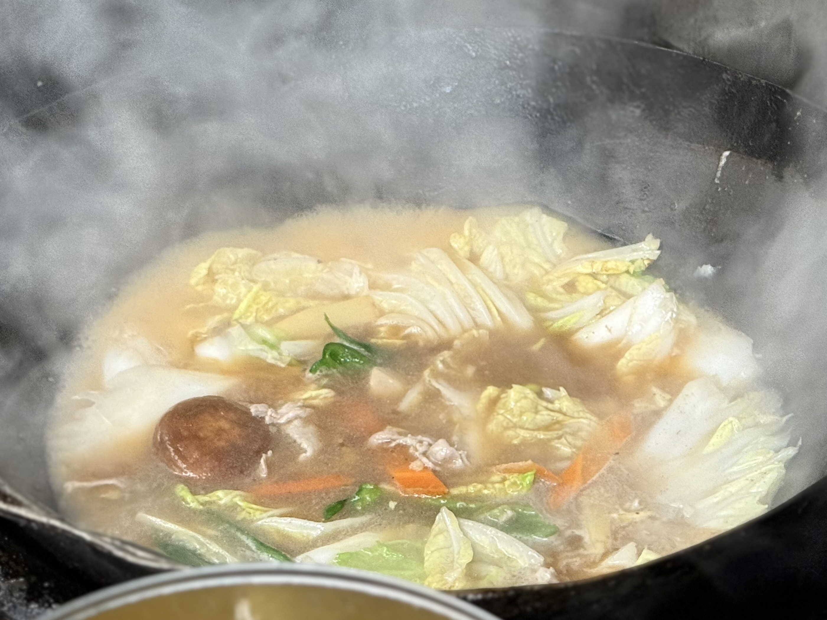 豚肉や白菜、にんじん、椎茸、ねぎなどの具材を炒め、特製スープとタレを加え、最後にとろみを足していきます。数分で、彩り鮮やかな広東麺が出来上がります。