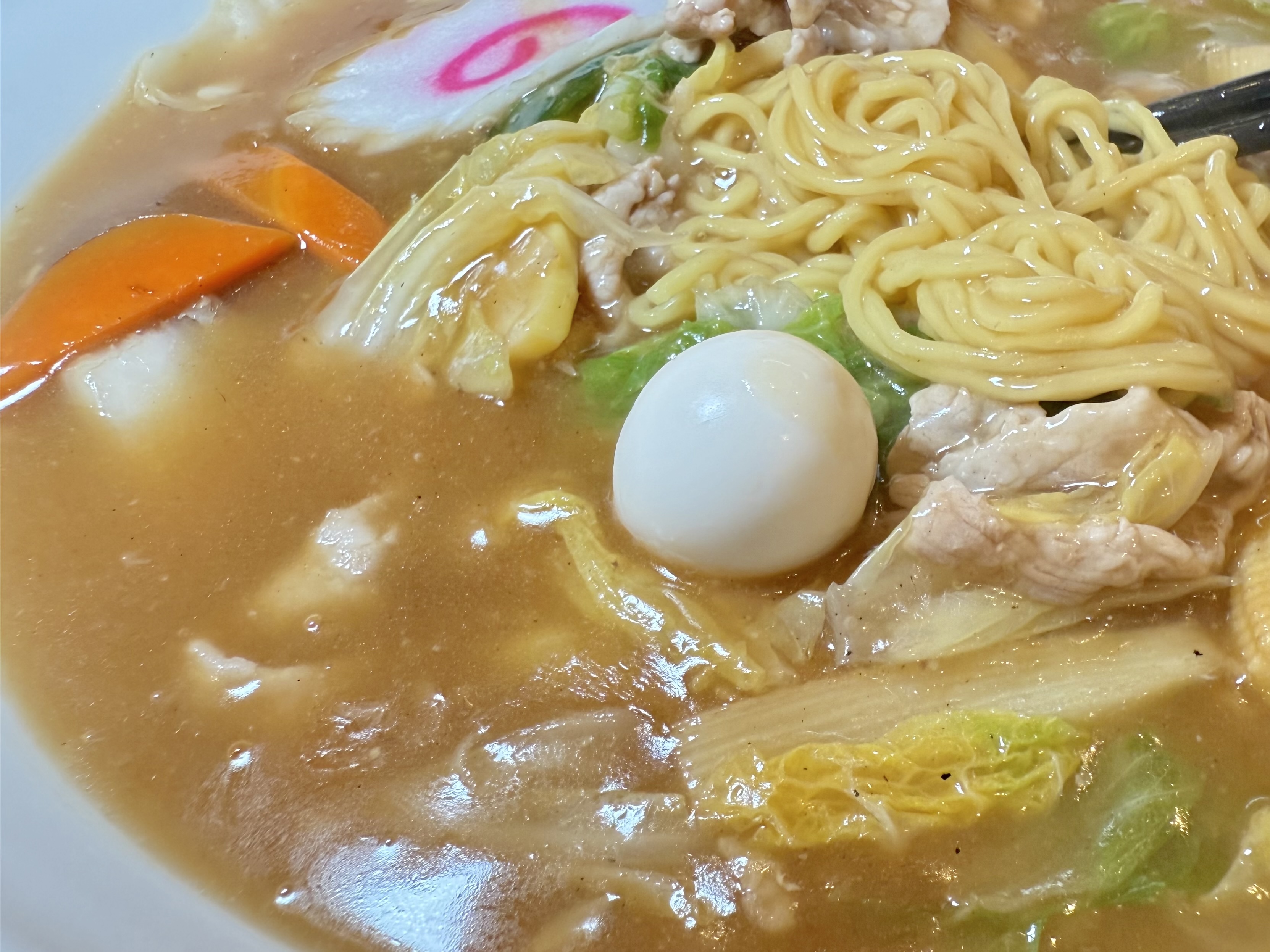 大きな丼いっぱいに広がるのは、黄金色に輝くとろりとした餡。湯気とともに立ち上る香りが、食欲を一層かき立てます。