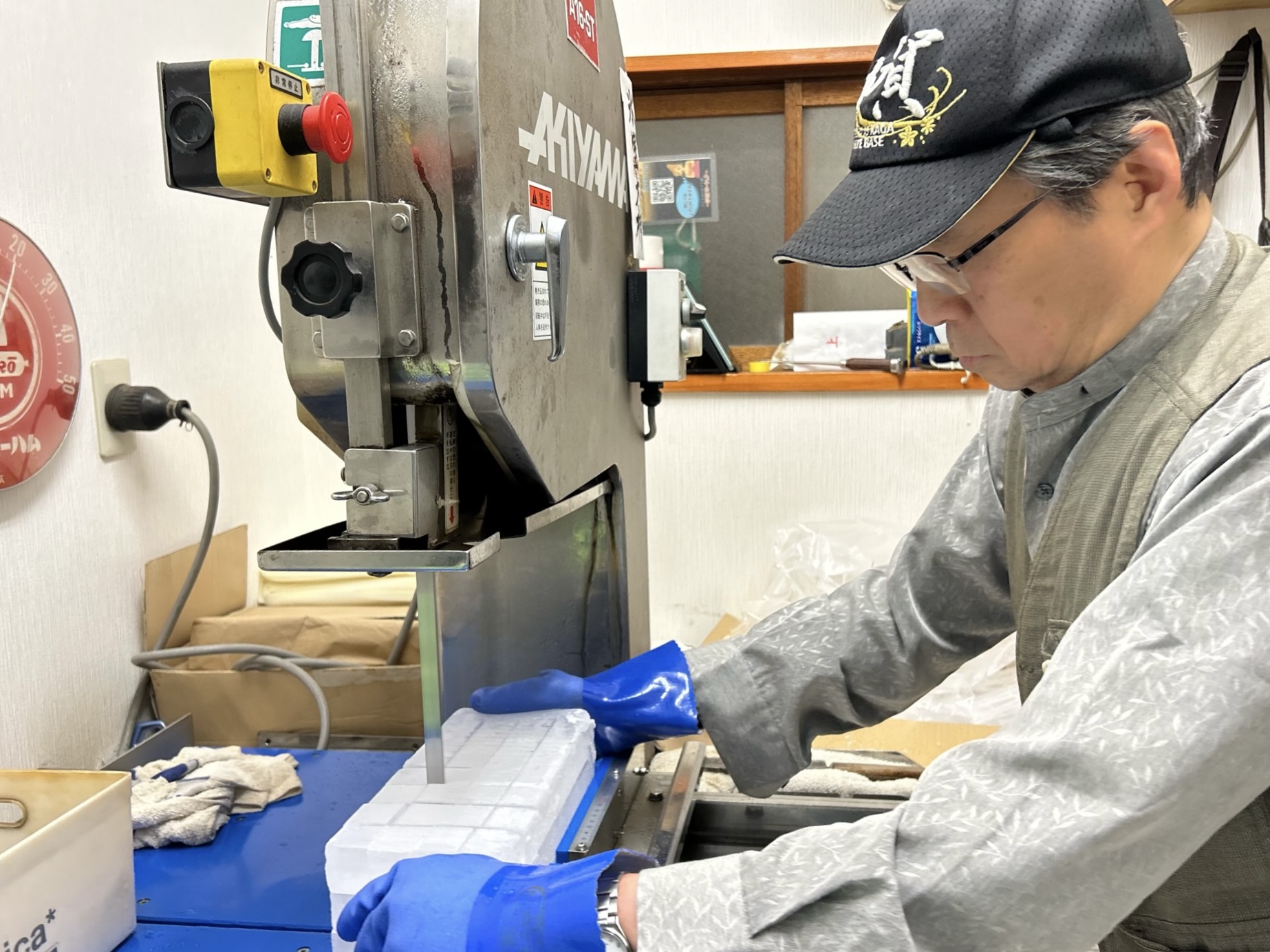 「バンドソーは肉屋の時にも使っていたので勝手が分かります。力任せに切れば刃も氷も折れます」と手際よく、3センチや4センチ、6センチの正方形や長方形などに切り分けていきます。