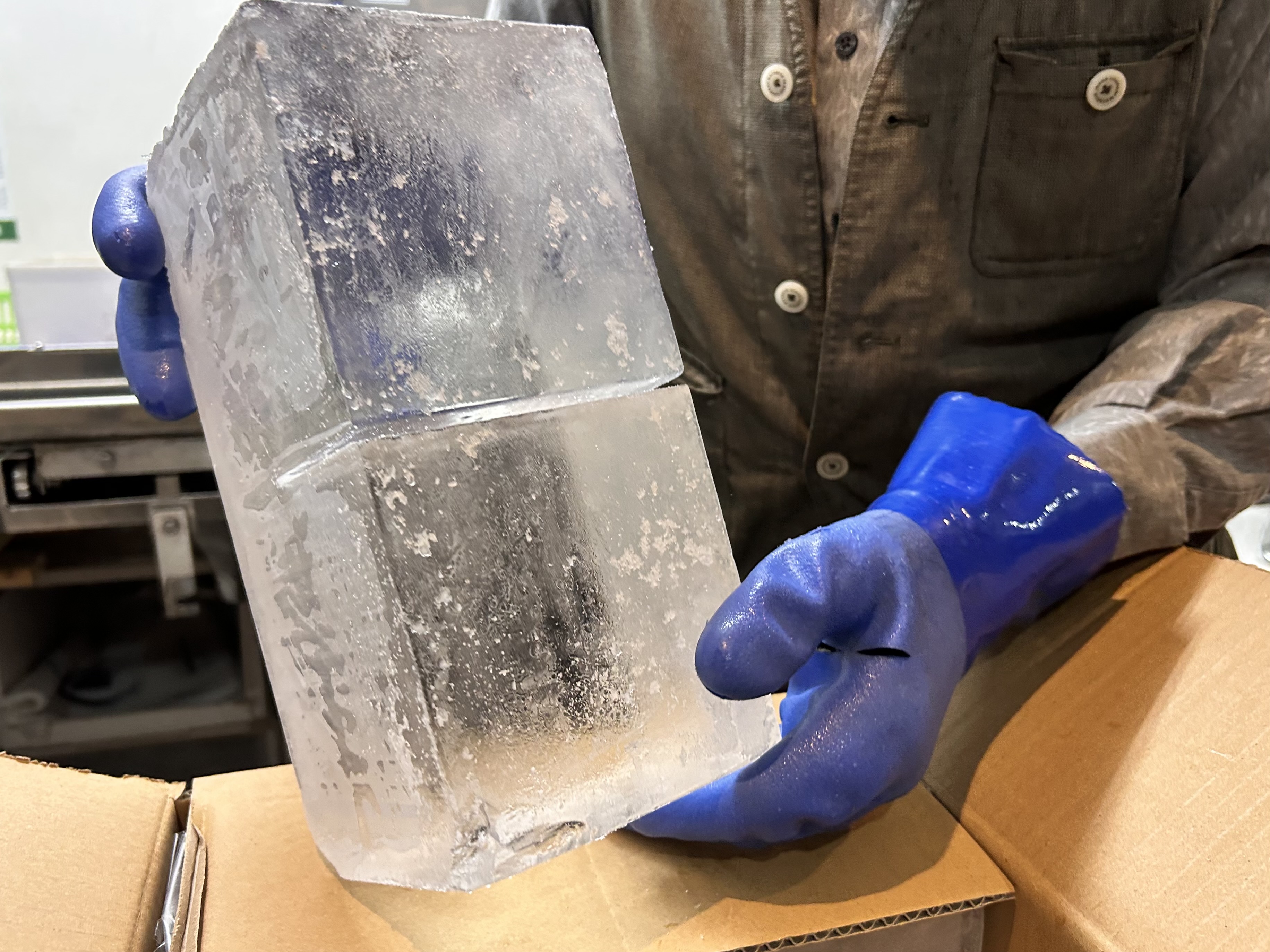 ここでは透明度が高く、溶けにくい「純氷」を販売しています。