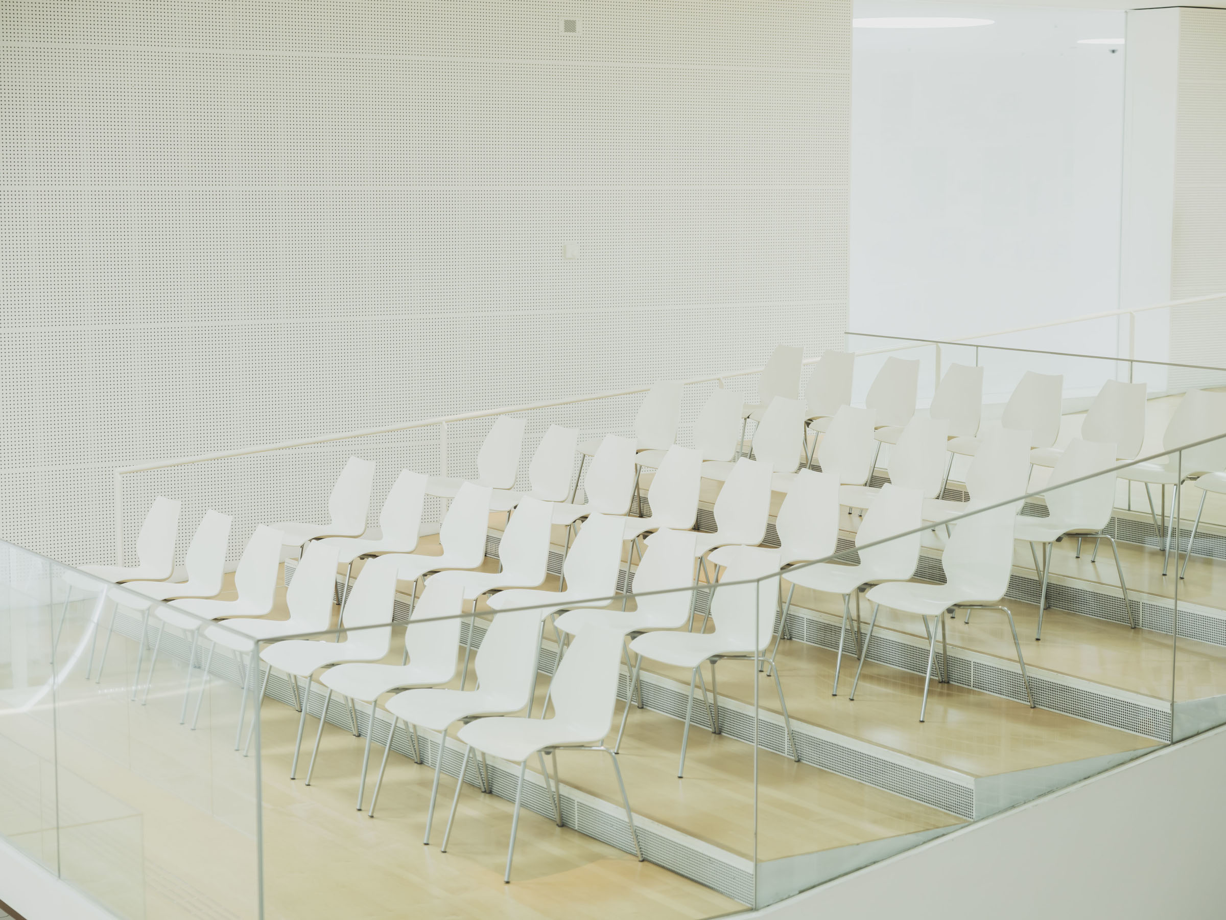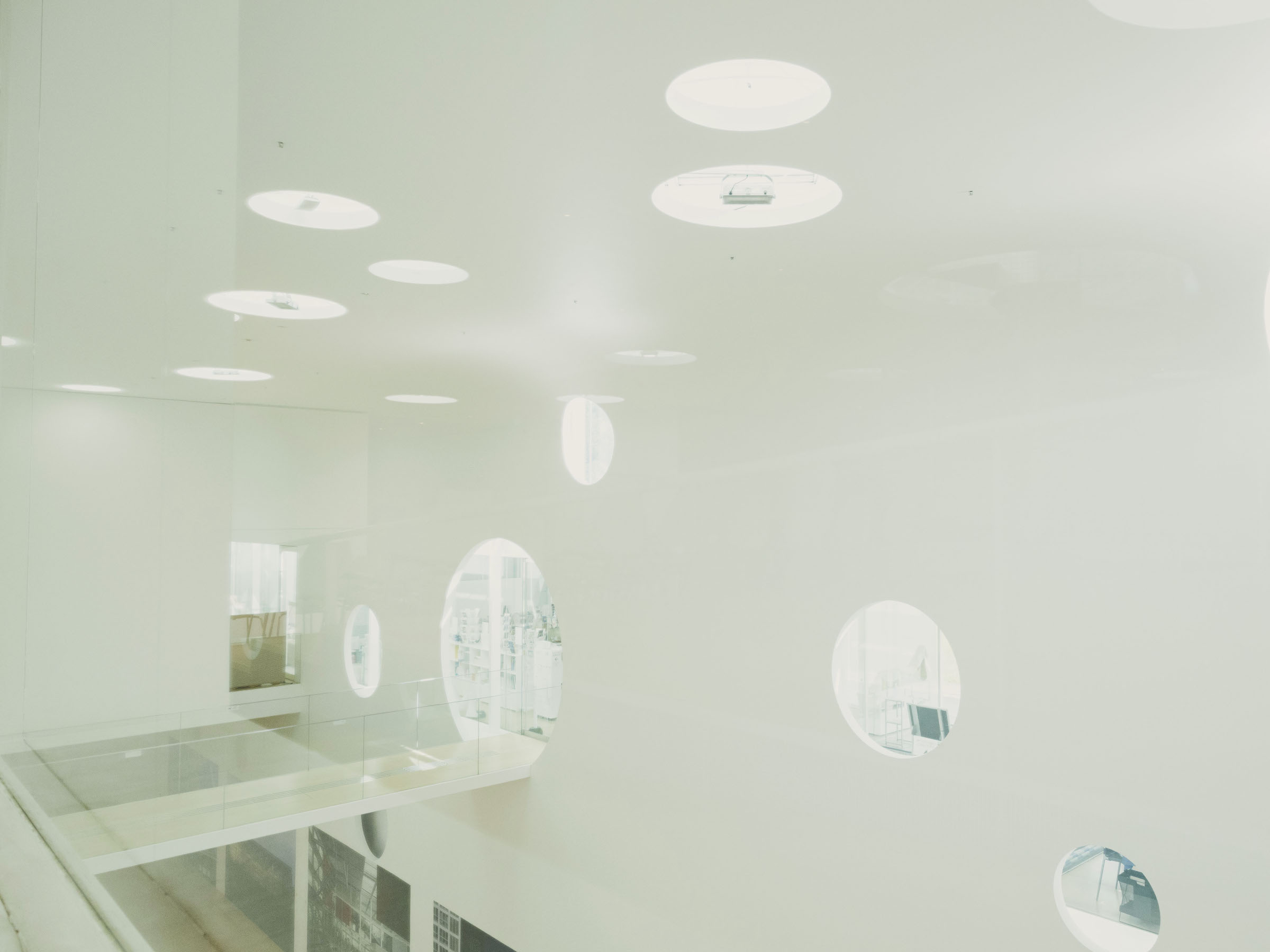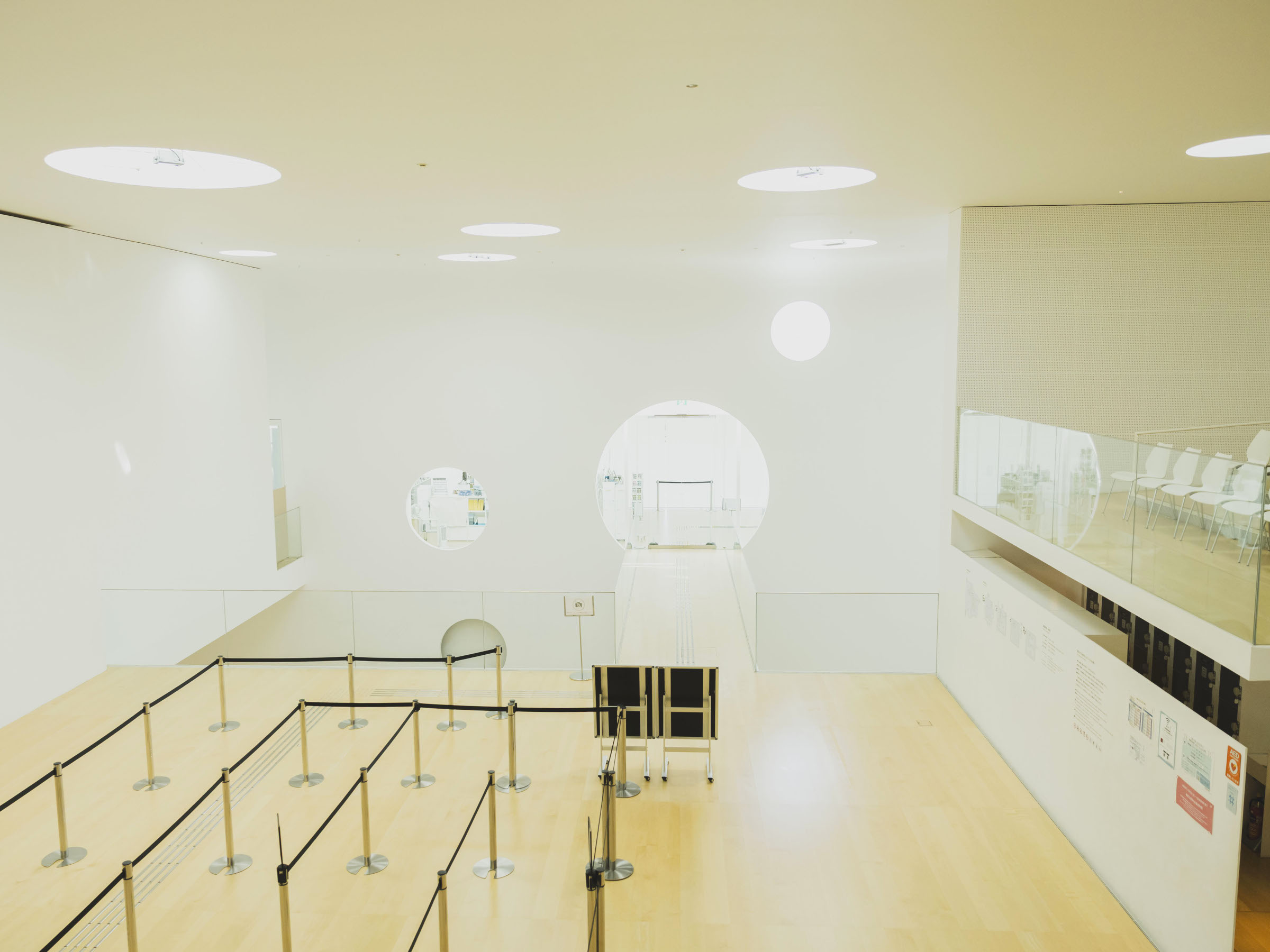 館内に入ると、吹き抜けになっているエントランスホール(2階部分)から、1階の企画展示室や中2階の多目的スペースまで見渡すことができます。天井や壁に大小様々な丸窓が設けられた館内は明るく、真っ白な壁を伝って光が回り、空間全体が輝いて見えます。