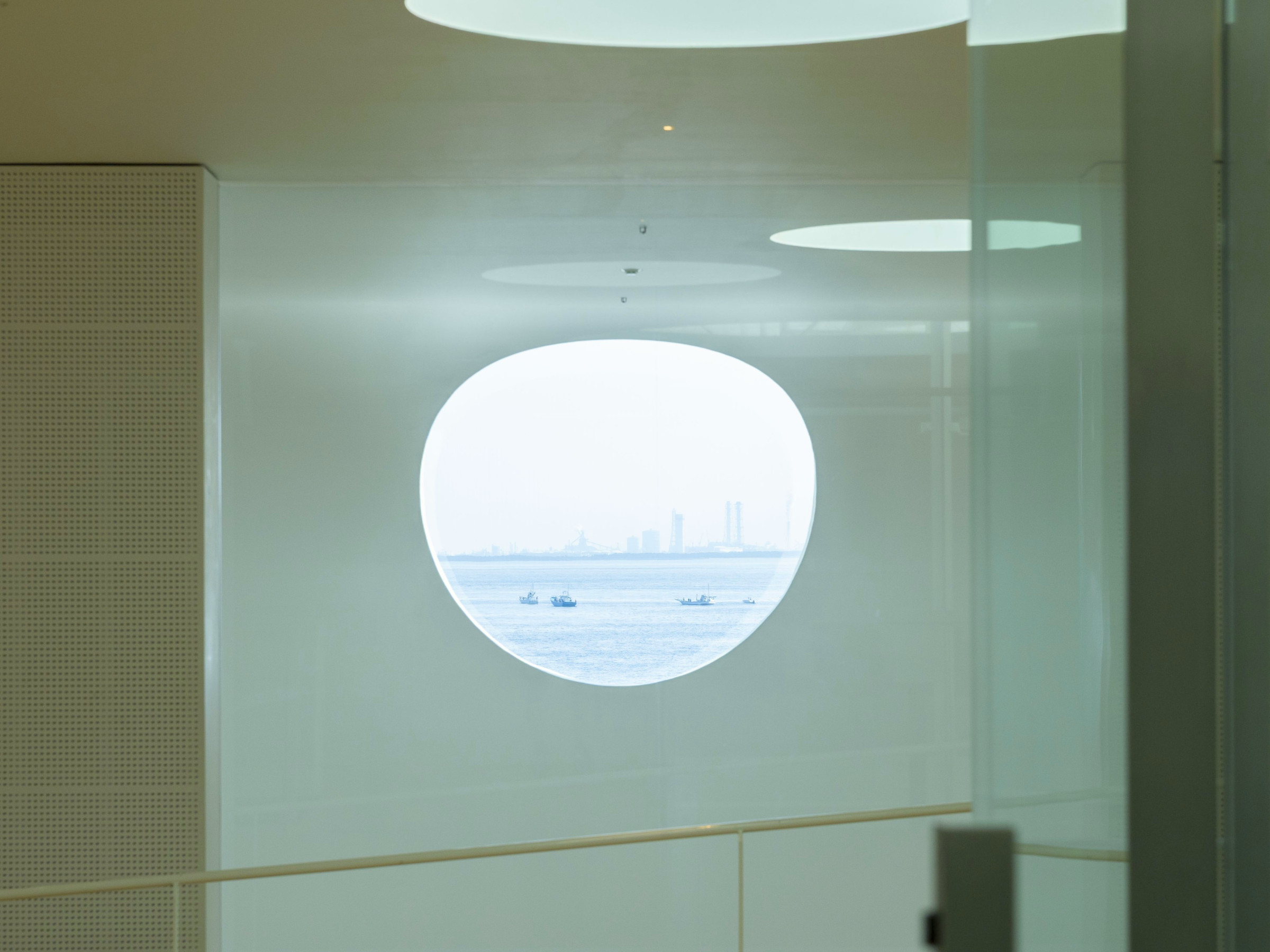 そしてふと壁際の丸窓に目を向けると、まるで絵画の額のように、観音崎公園の緑や東京湾の水平線(ときには船の姿も)など、風景を切り出していました。