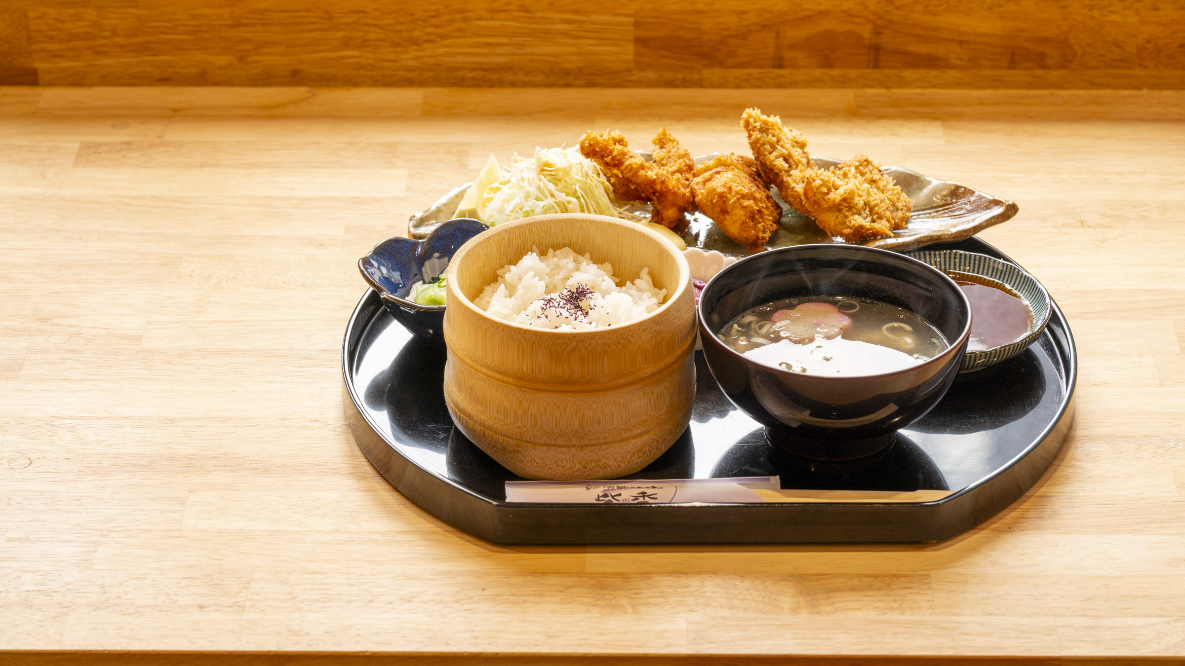 サクッとした仕上がりの「ミックスフライ定食」(1.800円)は、新鮮な鮮魚3種の揚げたてフライが味わえる人気メニューです。