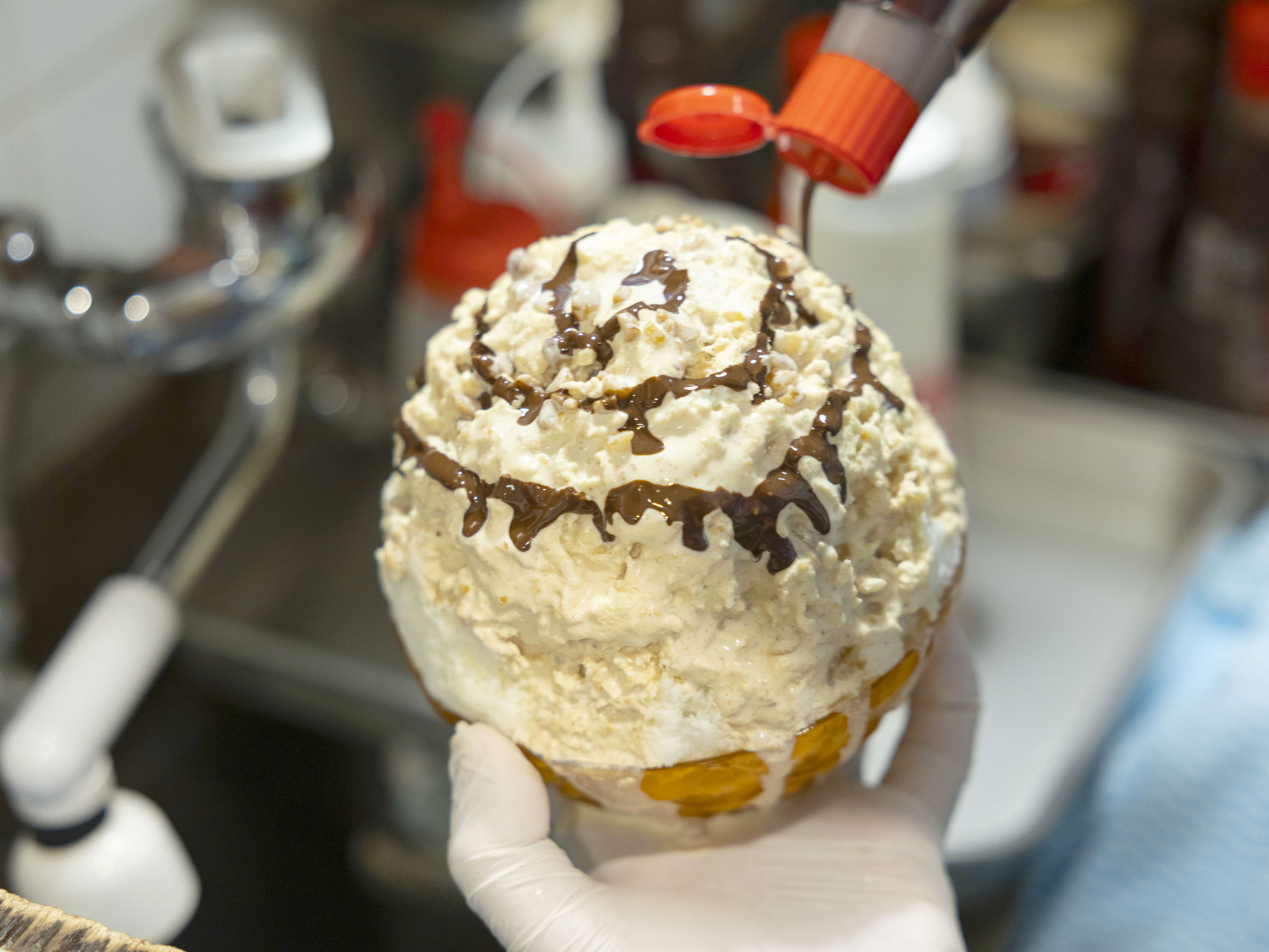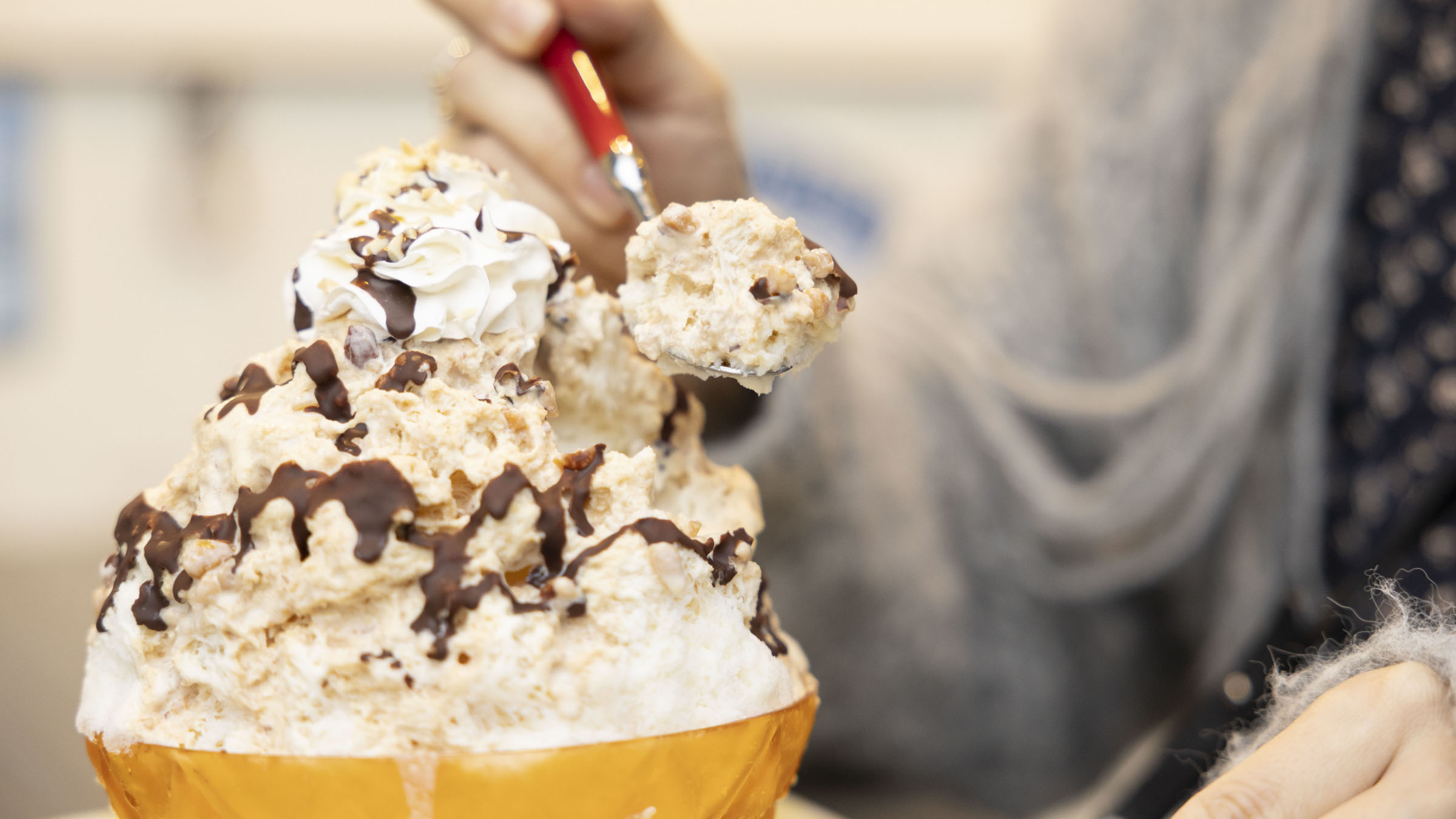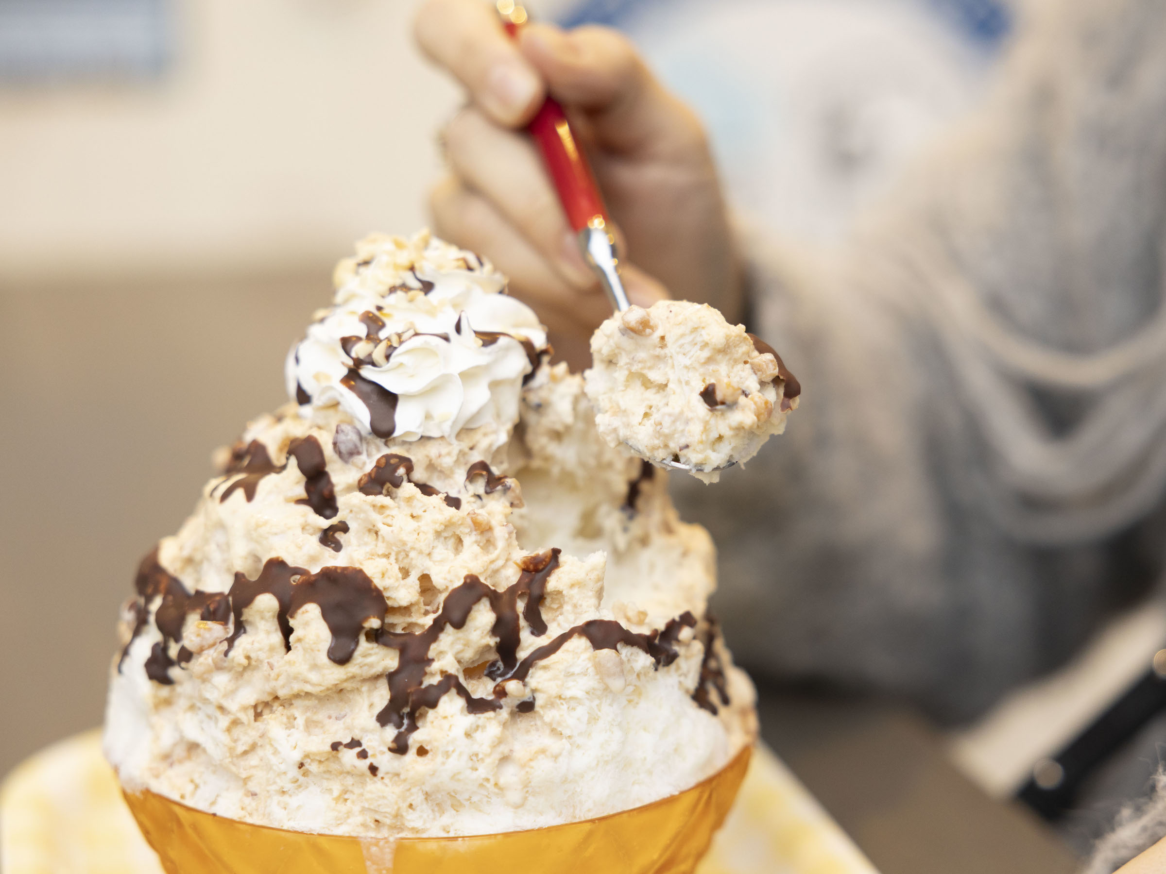 ふわふわの氷に、練乳シロップ、ピーナッツバターチャンクのソース、そしてチョコレートソースを重ね、ホイップクリームの“王冠”、仕上げにピーナッツクランチ。