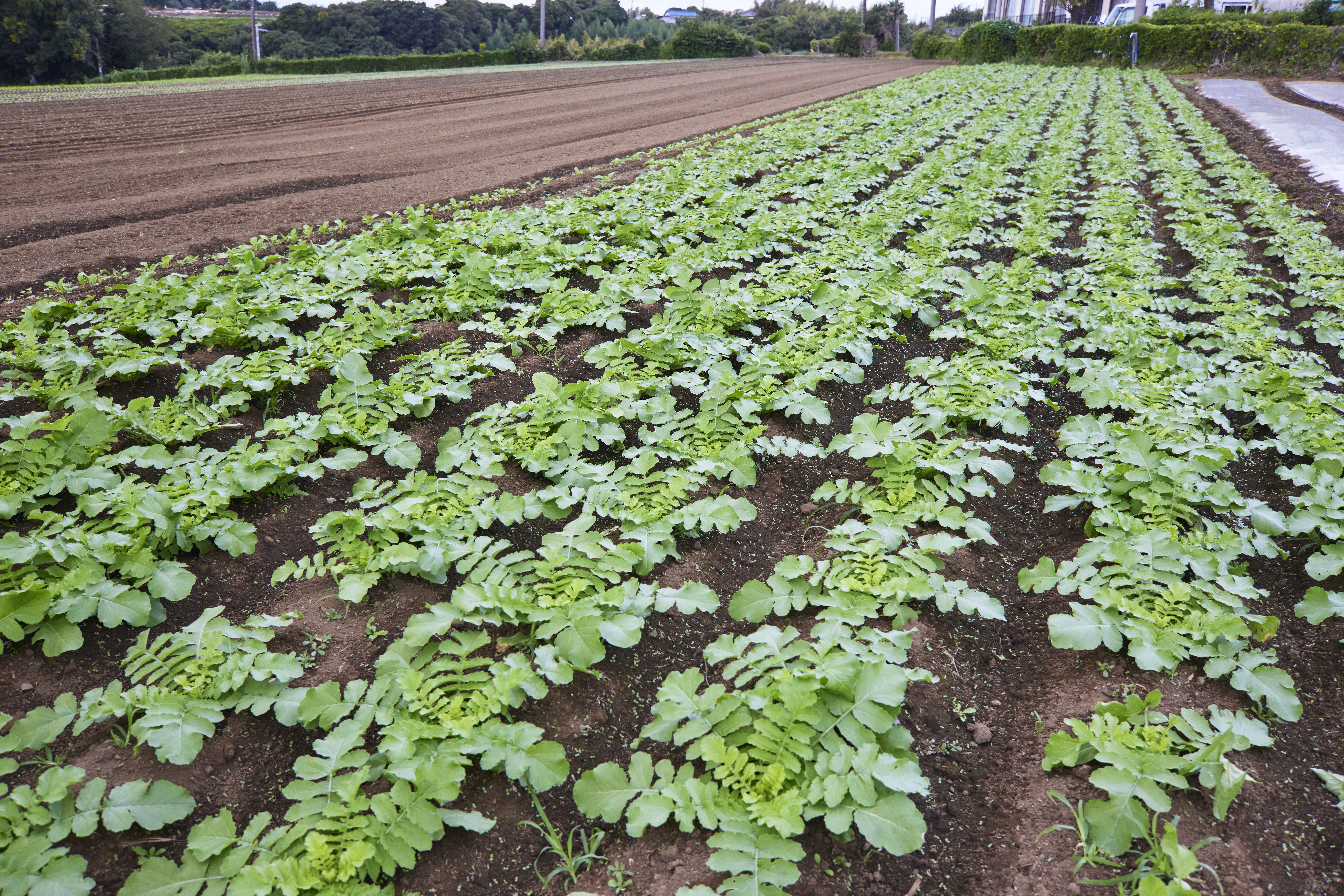 最初に訪れたのは、9月に種まきの作業を取材させていただいた「やまさ園」。 大根の葉が根元から放射状に勢いよく伸び、地面を覆うように横へ横へと一面に広がっていました。