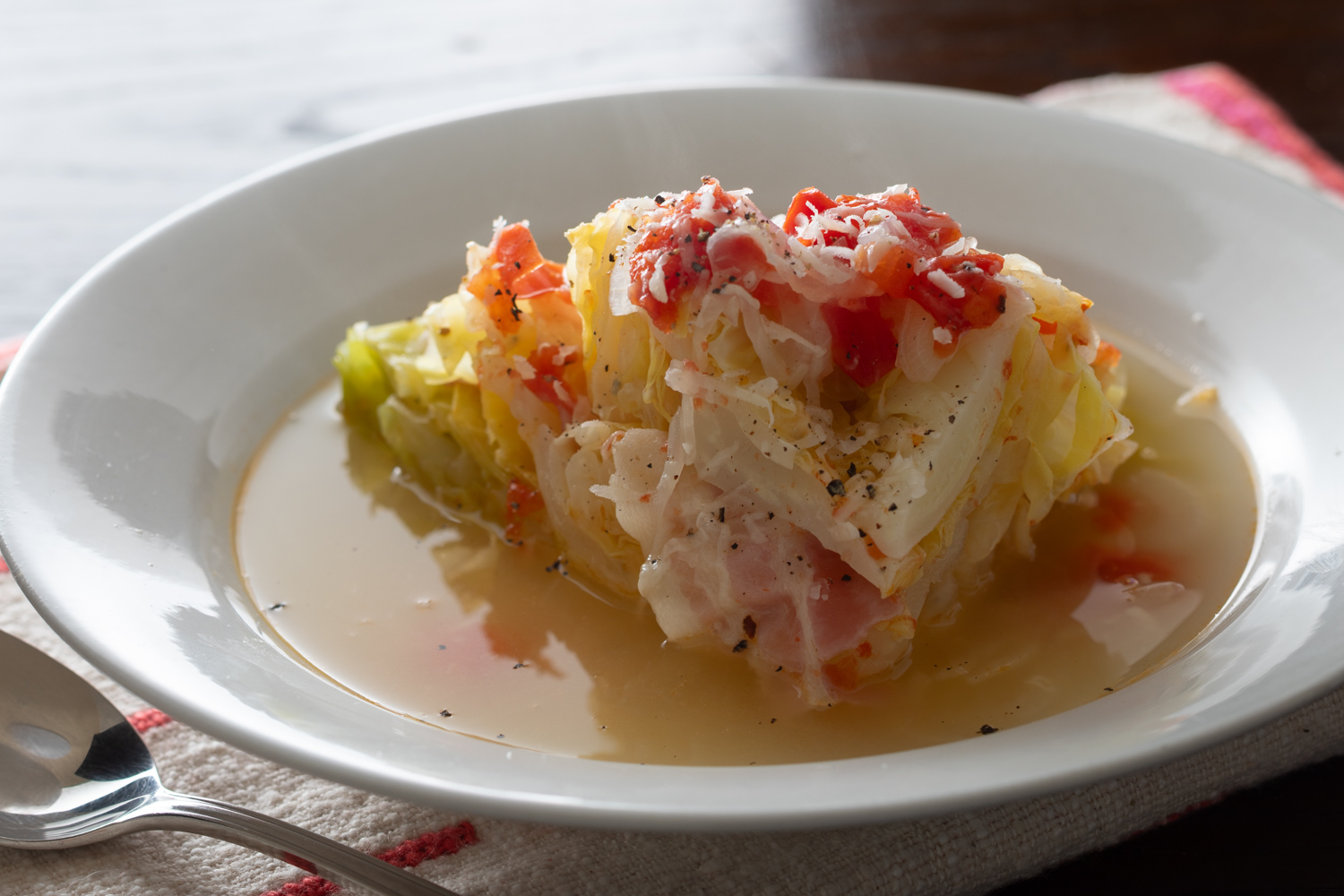 ④ 煮汁とともにキャベツを器に盛り、黒こしょう、パルメザンチーズをふります