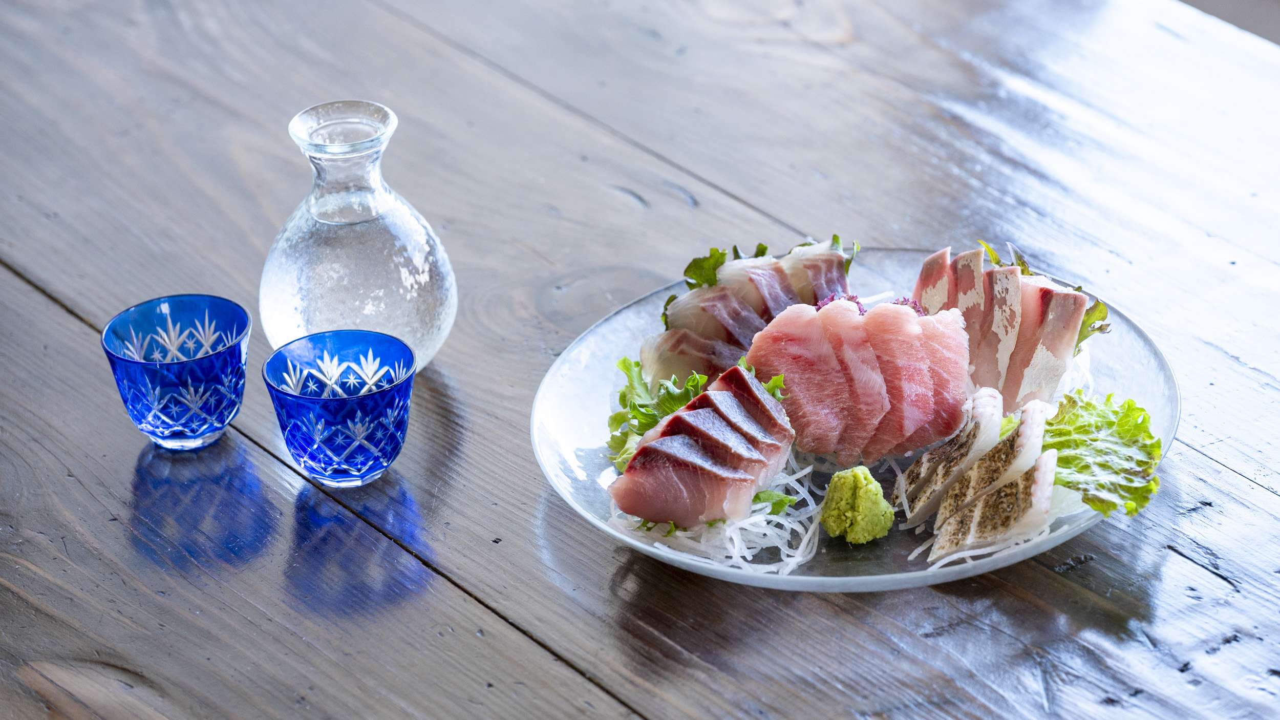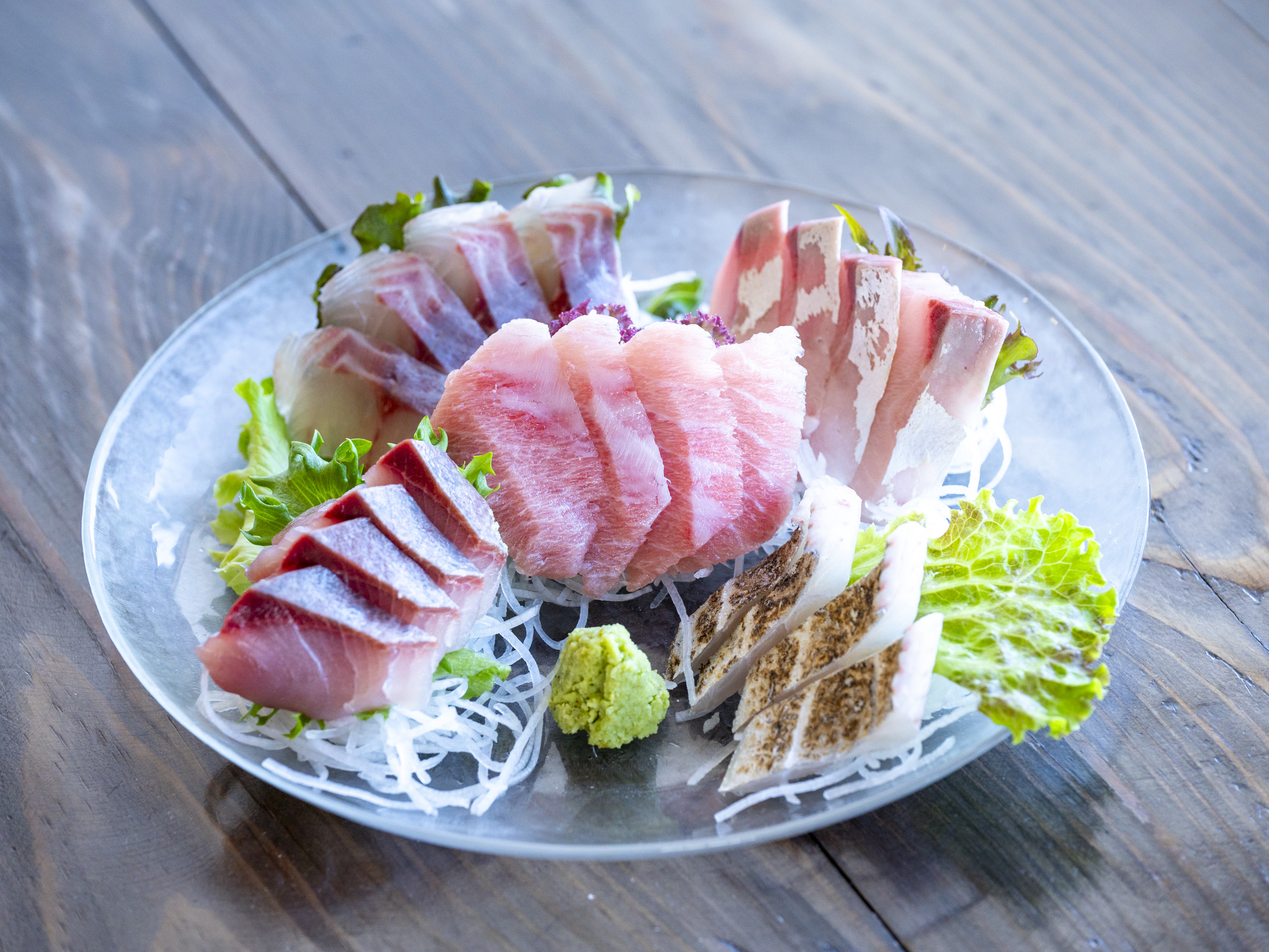 そんなお店を代表するメニューが「海畑刺身盛」(2,178円)。漁港にあがったばかりの魚は圧倒的に新鮮。この日はイサキ、ギンガメアジ、ブリ、キハダマグロ、タチウオ。