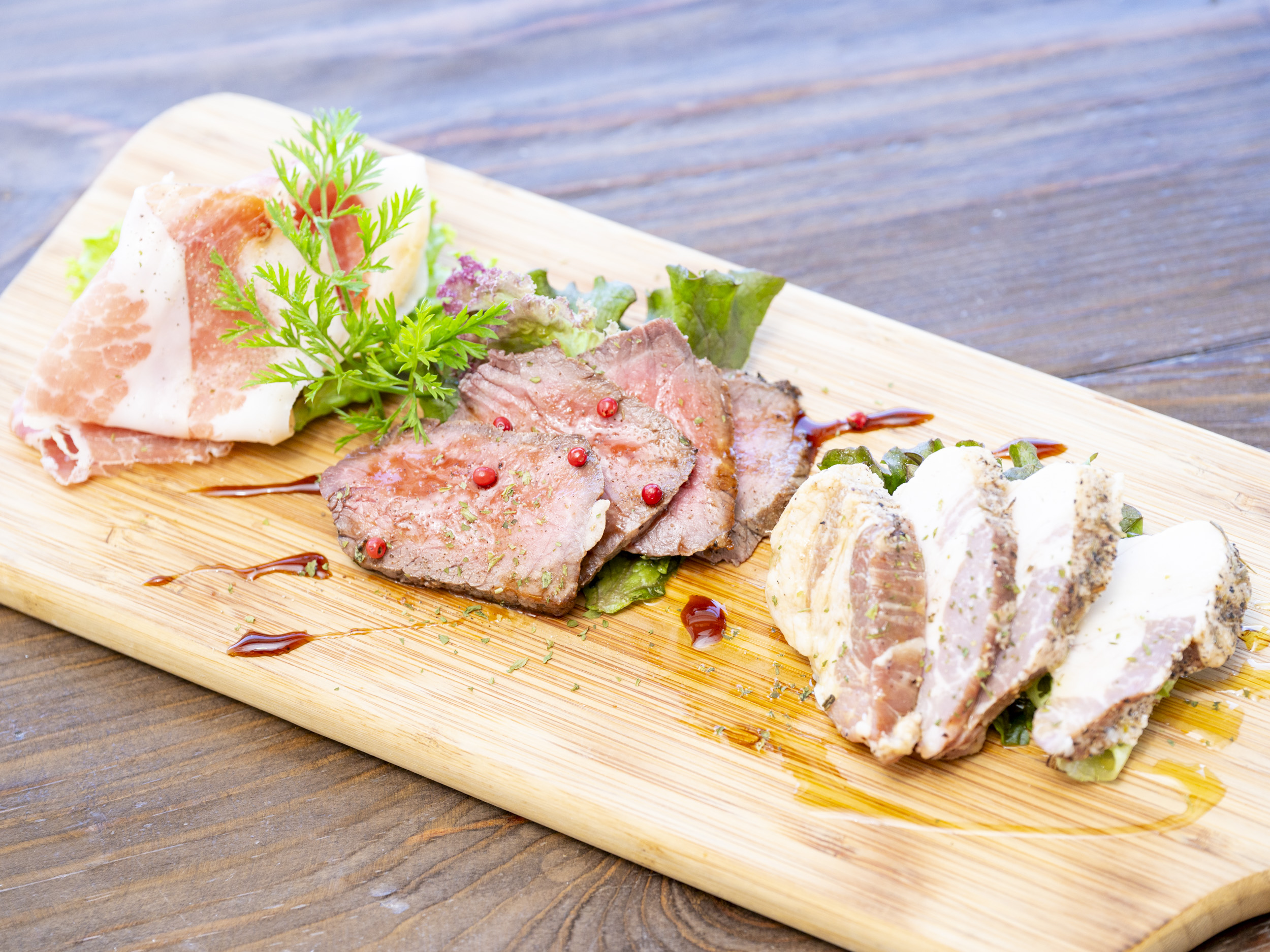 魚、肉、野菜をすべて地元の食材で完結するレストランです。「海畑刺身盛」(2,178円)は、その日に入荷した新鮮なお魚を堪能できる定番メニューです。