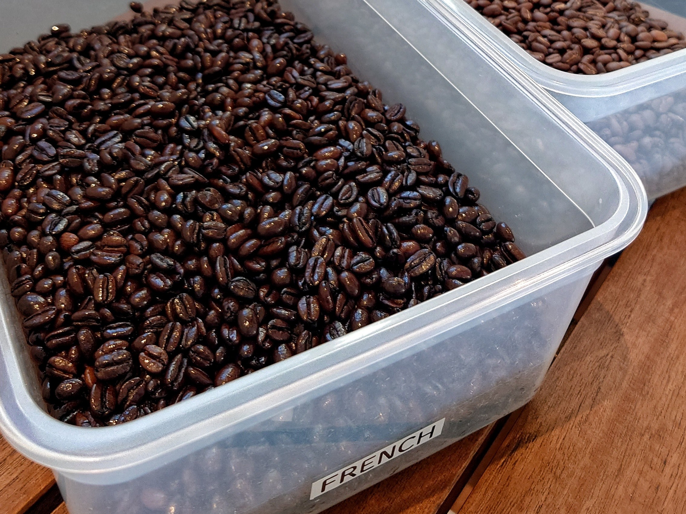 手前が深煎り、奥が浅煎り、真ん中がそのブレンド。色の違いがよくわかります。