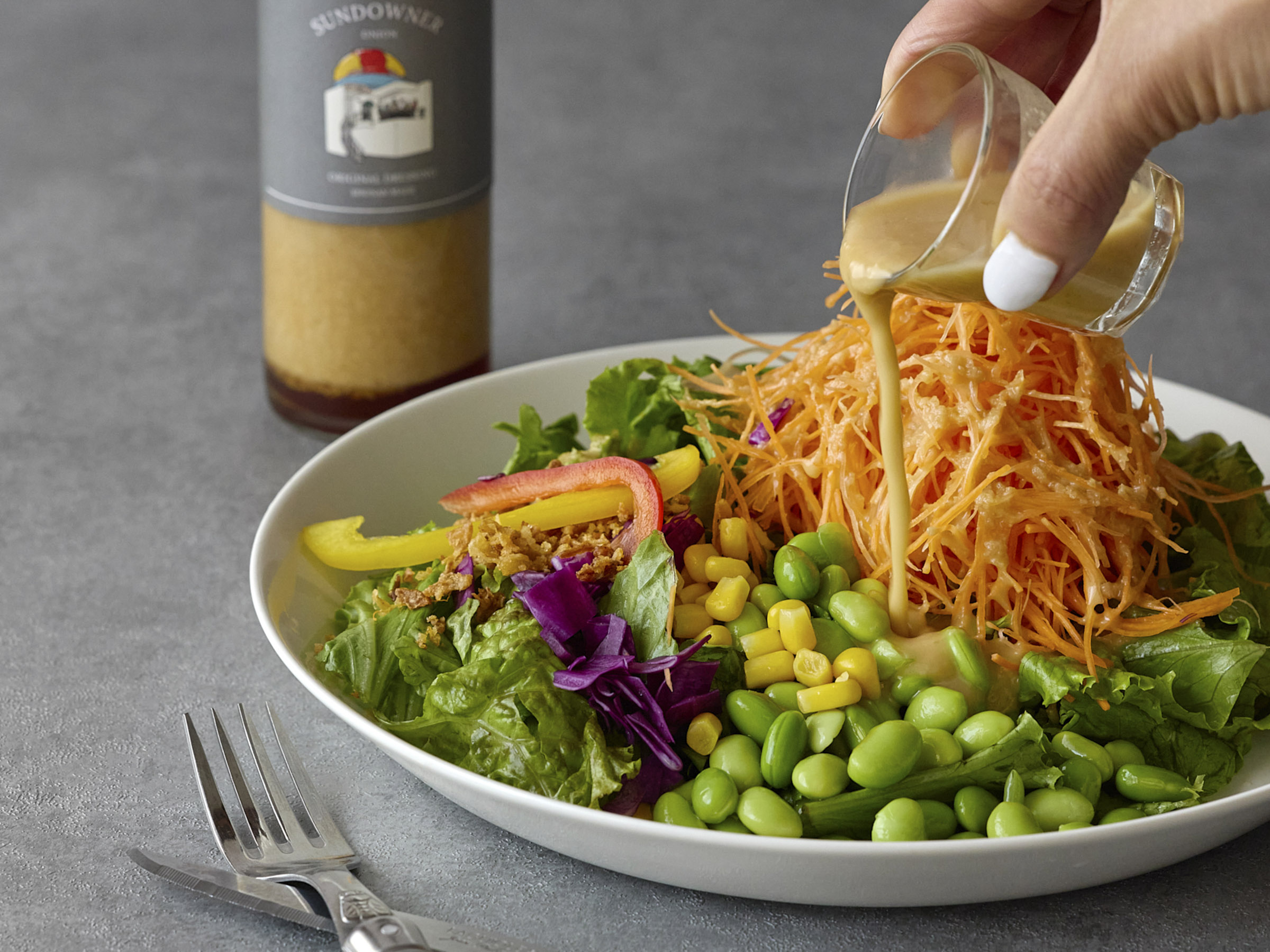 オリジナル自家製生ドレッシングは、保存料や着色料は使わず、加熱していない生のタマネギをたっぷりと使っているのが特徴です。子どもからお年寄りまで、幅広い年代から愛される優しい味わいです。