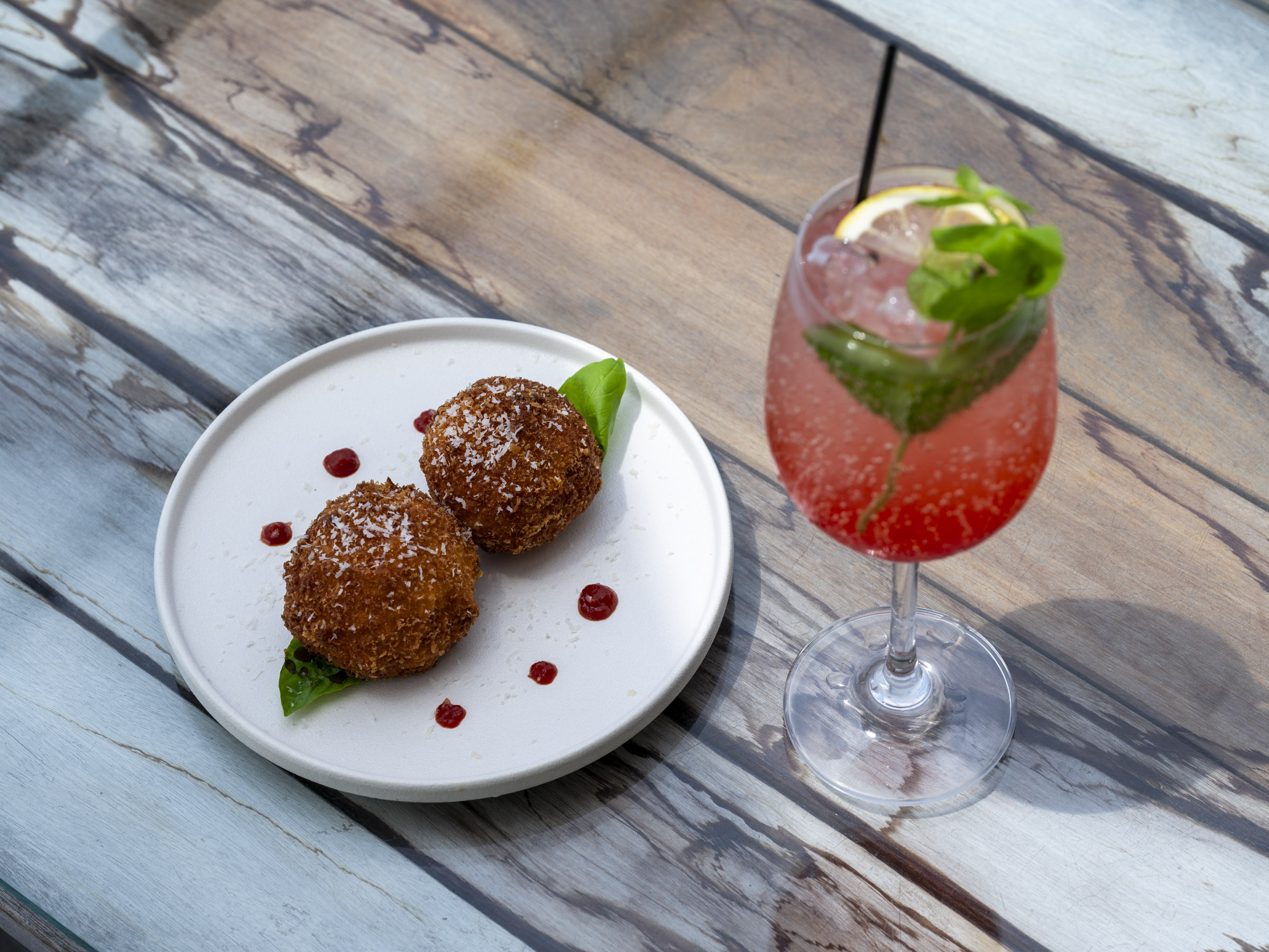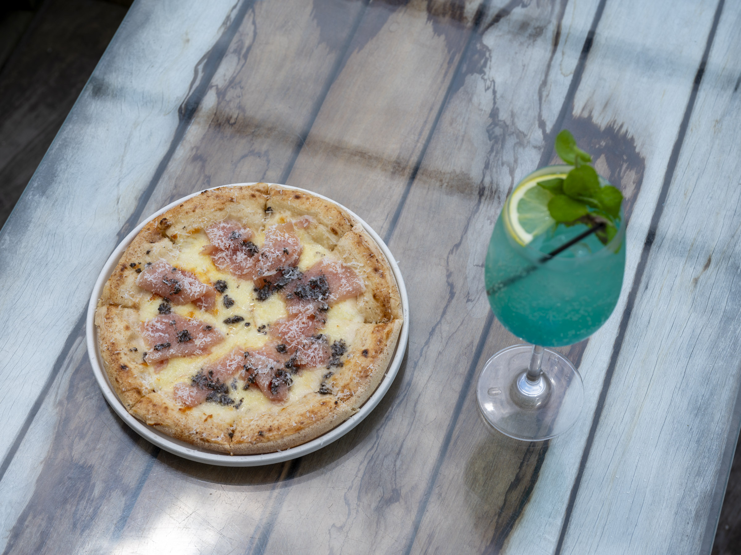 ゆったりとした空間がひろがる店内や屋外テラスでは、爽やかな風も癒やされながら美味しいフードメニューに舌鼓。特に人気のトリュフ生ハムピザは、分厚く切られた生ハムと溶け合うチーズの風味にリピーターが続出しています。