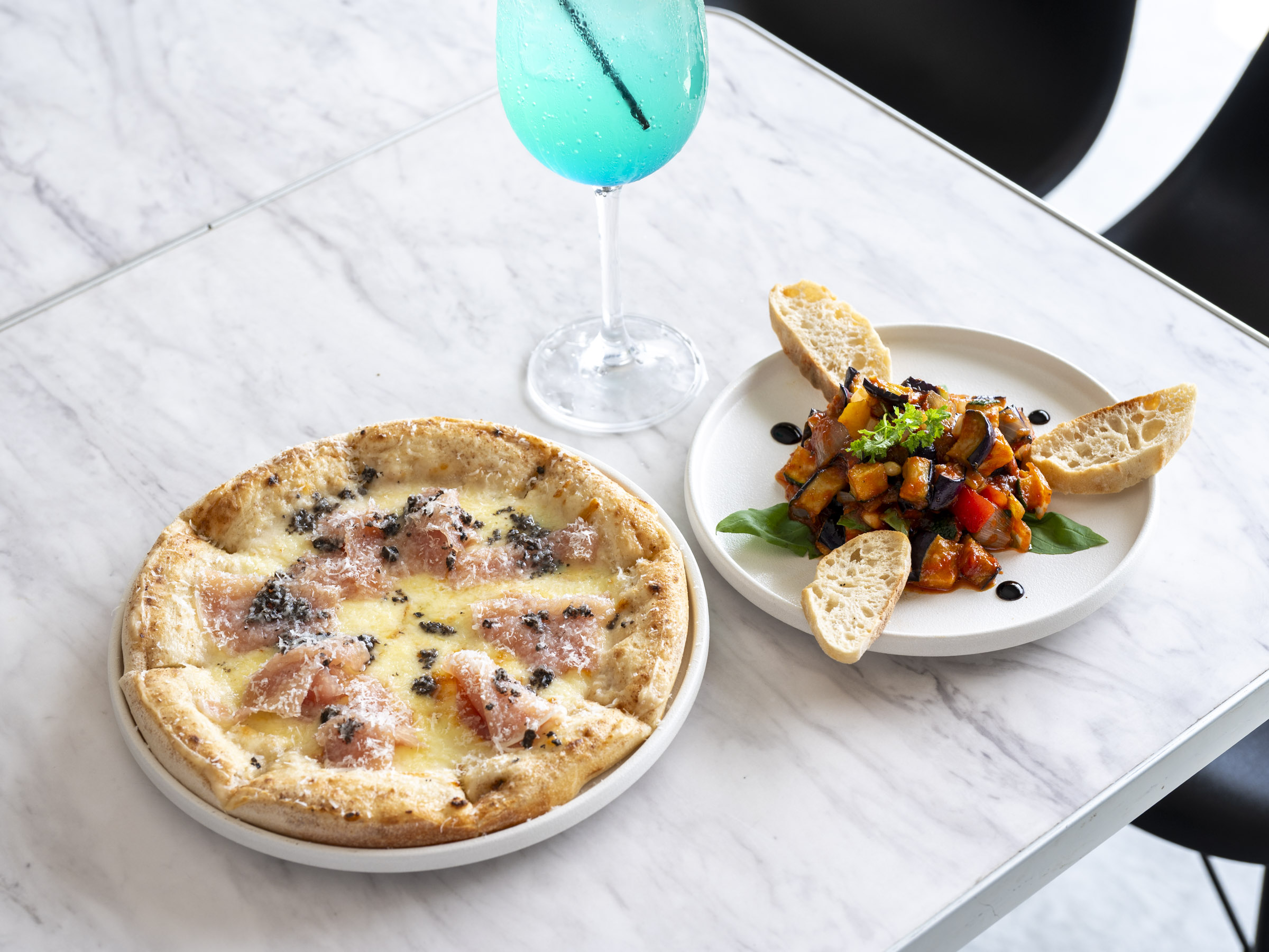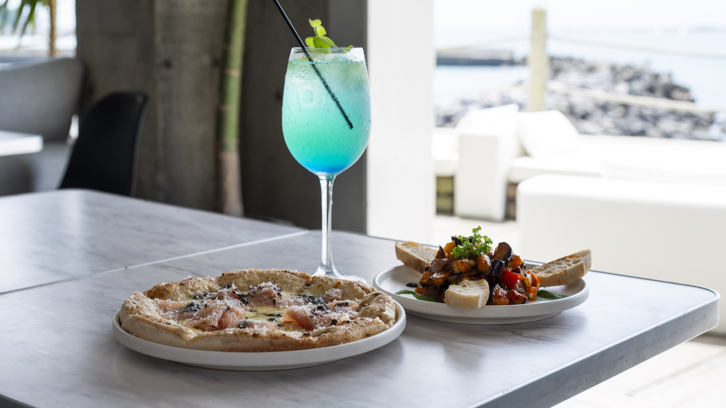 「トリュフ生ハムピザ」(2,500円)と「ラタトゥイユ」(900円)、ブルーハワイを彷彿とさせるモクテル(ノンアルコールカクテル)の「VIRGIN BLUE HAYAMA」(1,000円)を頂いたら、異国のリゾート地で時間を忘れてのんびりしているような気持ちになりました。