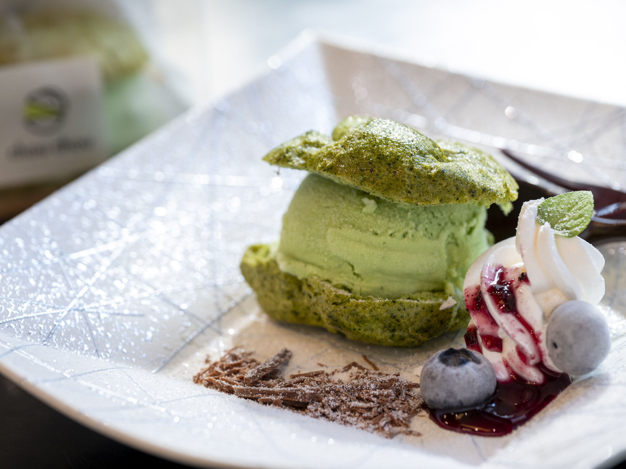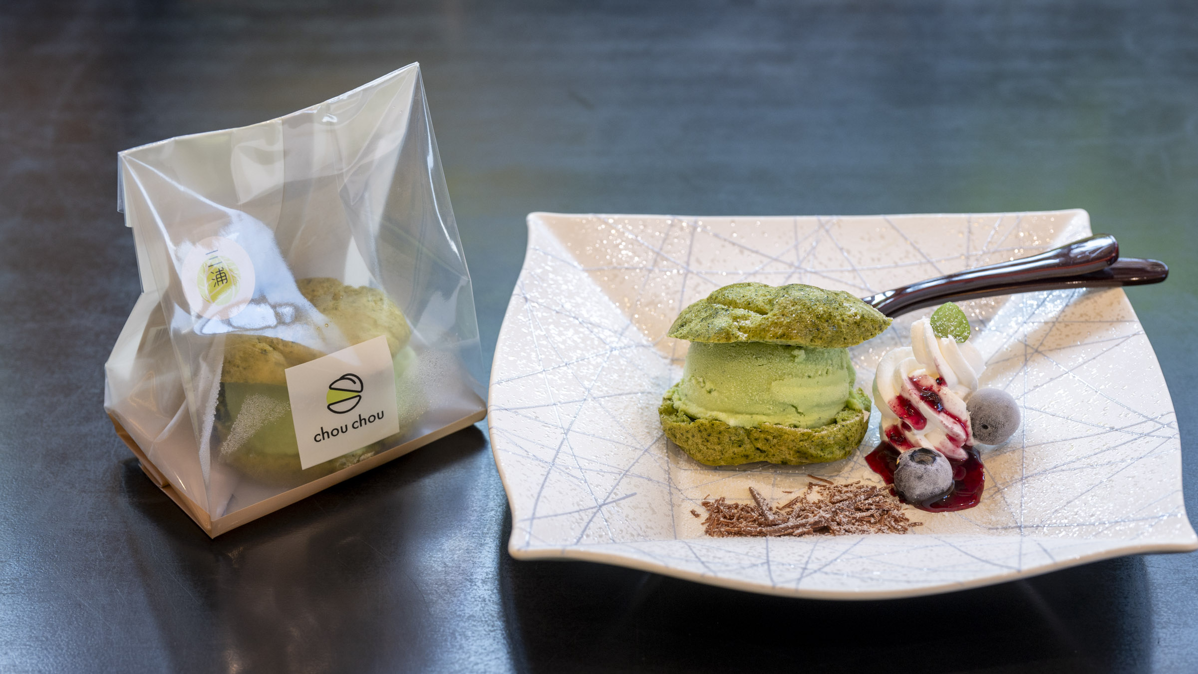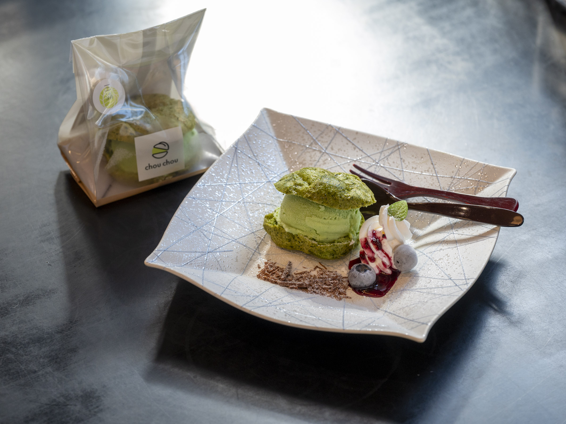 シューだけでなく鮮やかなグリーンが象徴的なアイスも自社工場で作られるchou chou。ぜひお店でそのこだわりを味わってみてください。