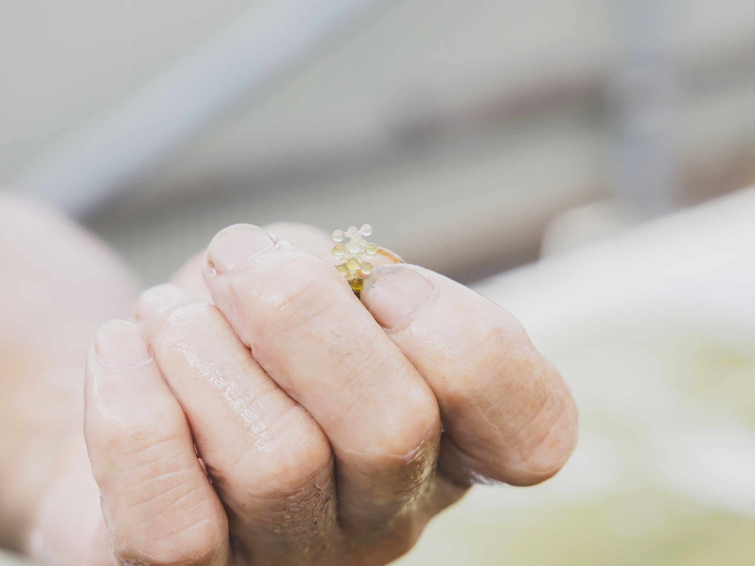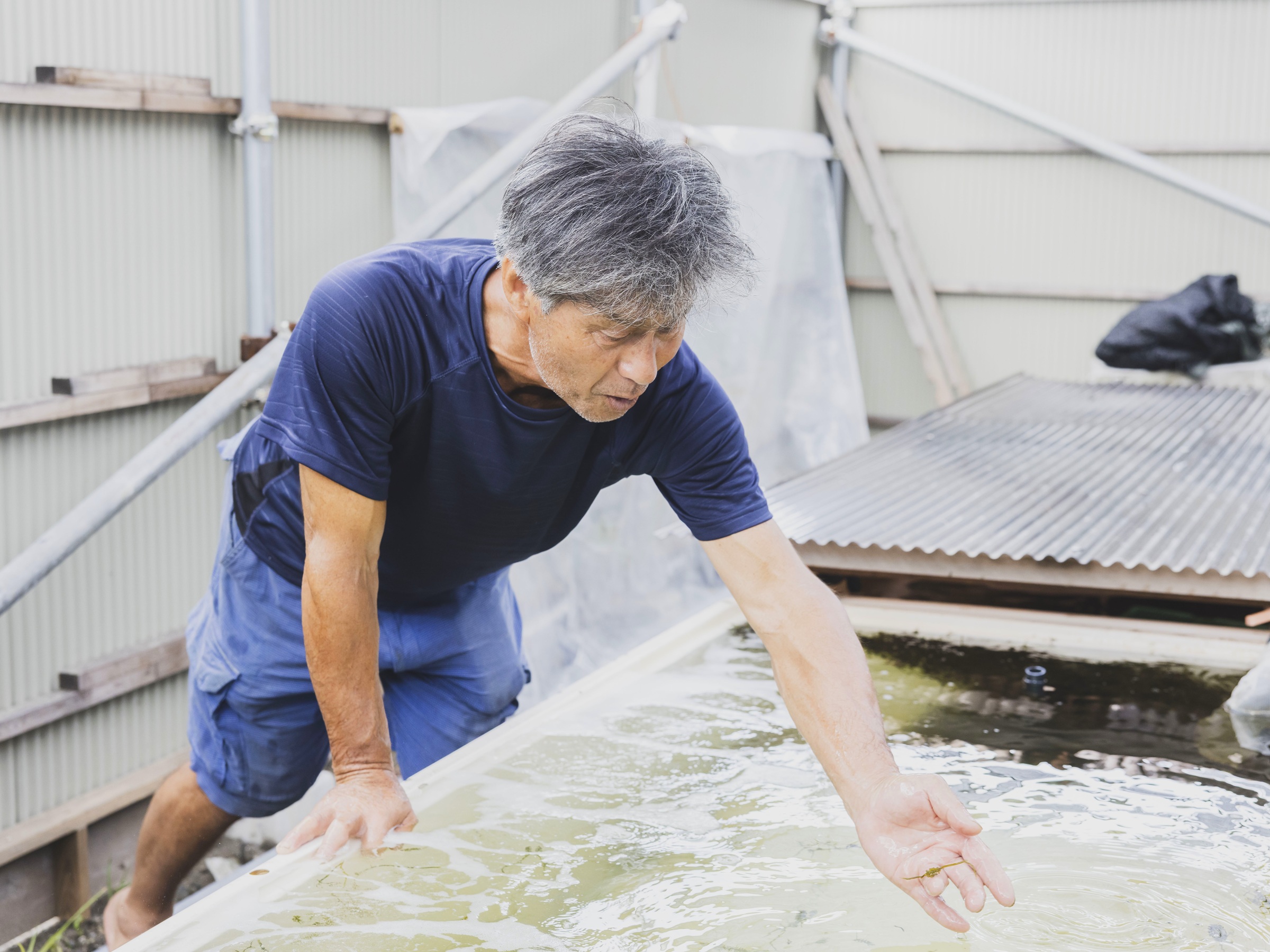 良治さんは若い漁師二人に「無理せず、厳しくなったら諦めたって構わない」と声を掛けながらも、海苔養殖の技術を伝え、海ブドウの養殖にも力を貸しています。「二人が安心して食べて行けるように、私たちが働かされているんですよ」と笑いながら、海ブドウを優しい眼差しで見つめていました。