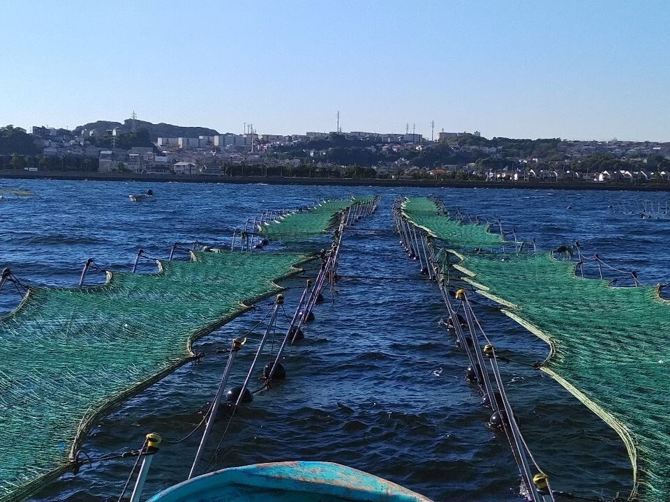海水温が下がる秋になると走水の沖合には、海苔の種をつけた網が張られます。海苔養殖において味を左右するのは「干出」という、海苔網を海面に出して乾燥させる作業です。