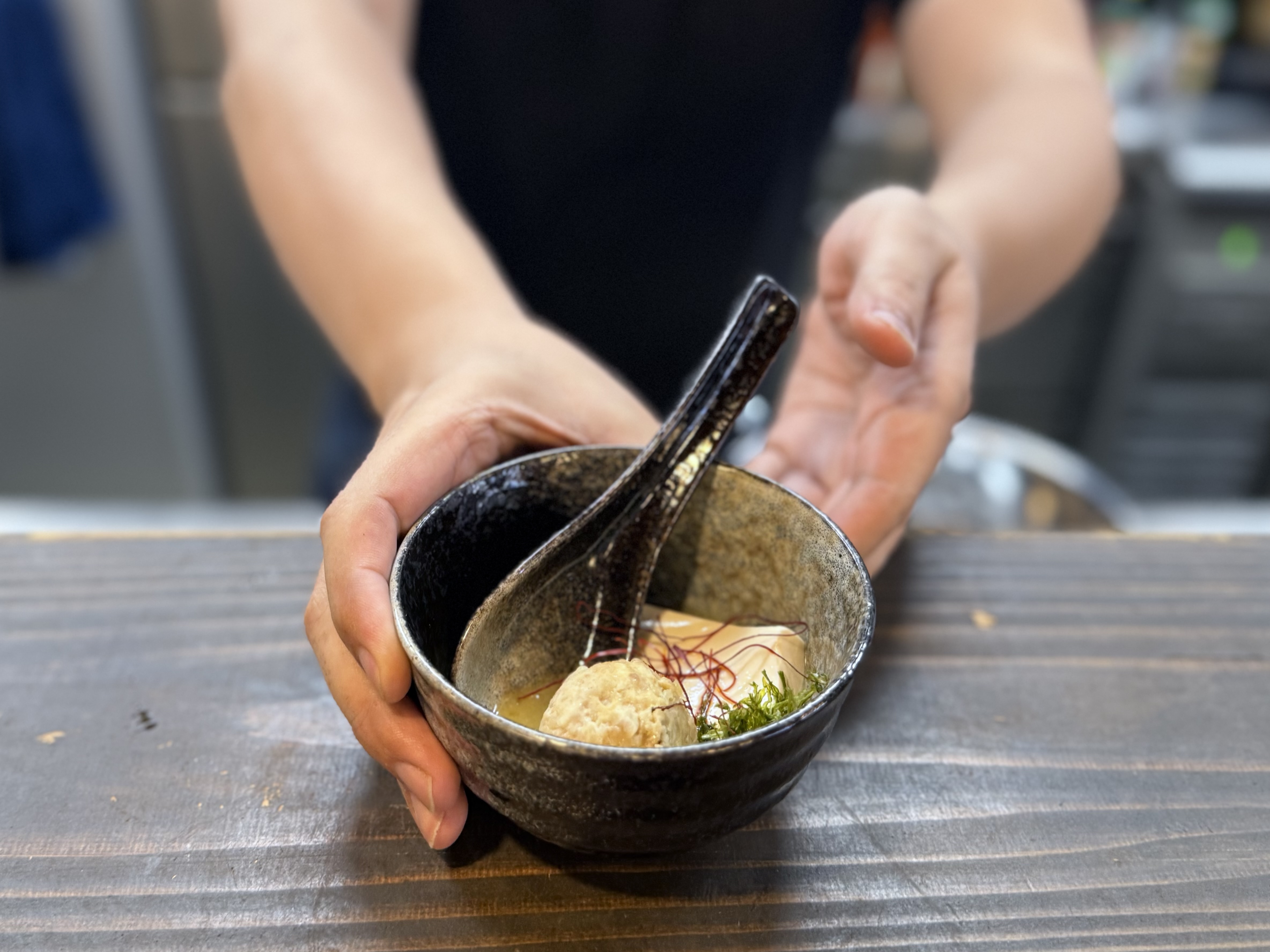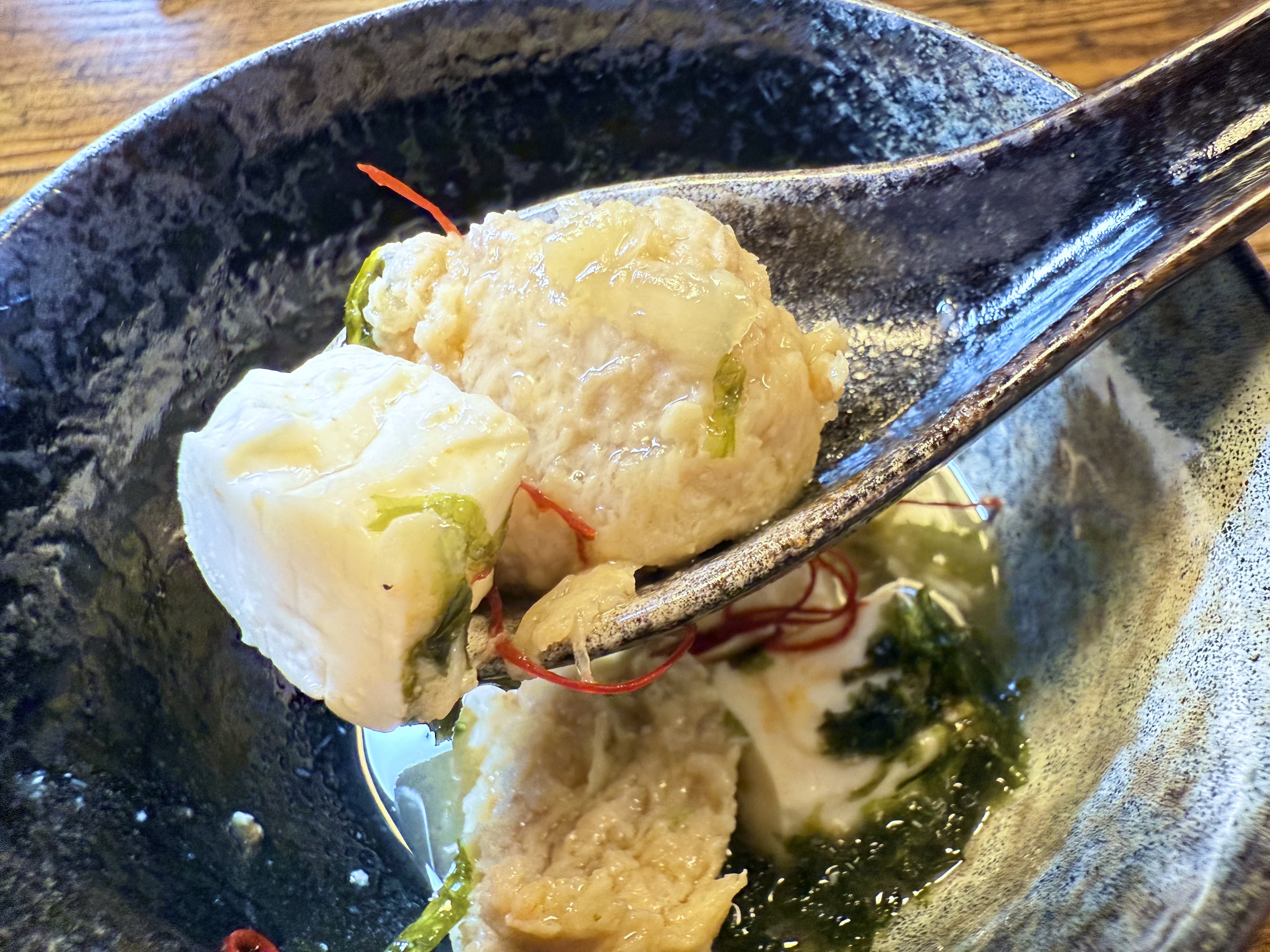 自家製のふわふわジューシーなつくね、なめらかな口当たりの絹ごし豆腐、そして磯の香りが広がる高級ばら海苔が一体となり、濃厚な旨みが口いっぱいに広がります。