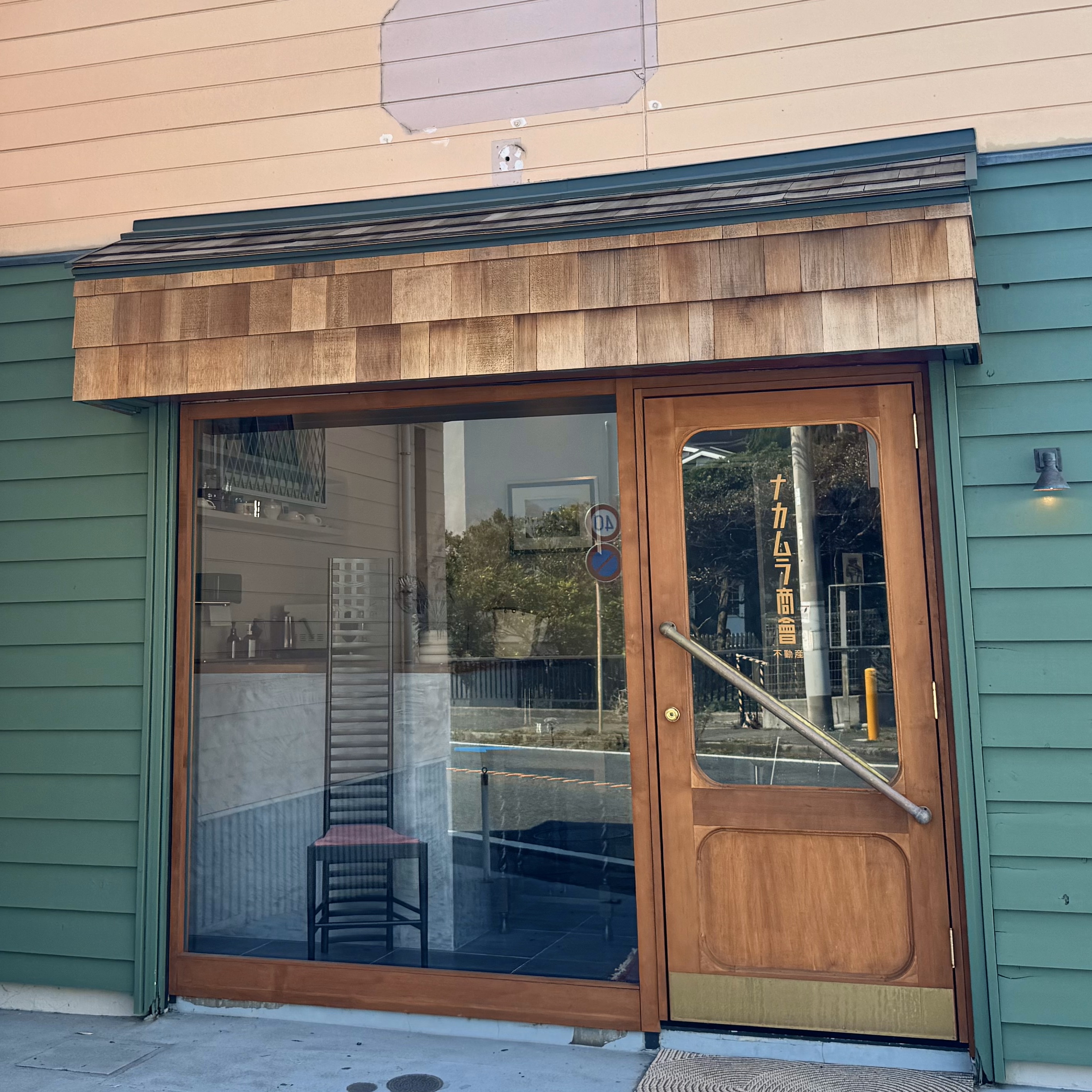目を引く杉板のウロコ張りの屋根にグリーンの外壁。一見、デザイン事務所?テーラーショップ?と思いそうですが、ここは町の不動産屋です。
