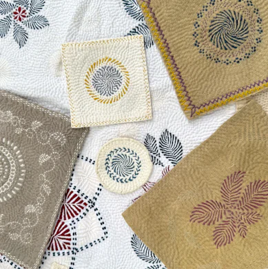 「カンタ」とは、インド・バングラデシュにまたがるベンガル地方に古くから伝わる伝統的な刺繍です。もともと家族の幸福と繁栄を祈って作られてきました。 基本的には「並縫い」をひと針ひと針を重ねていき、さまざまな表情を生み出していきます。
