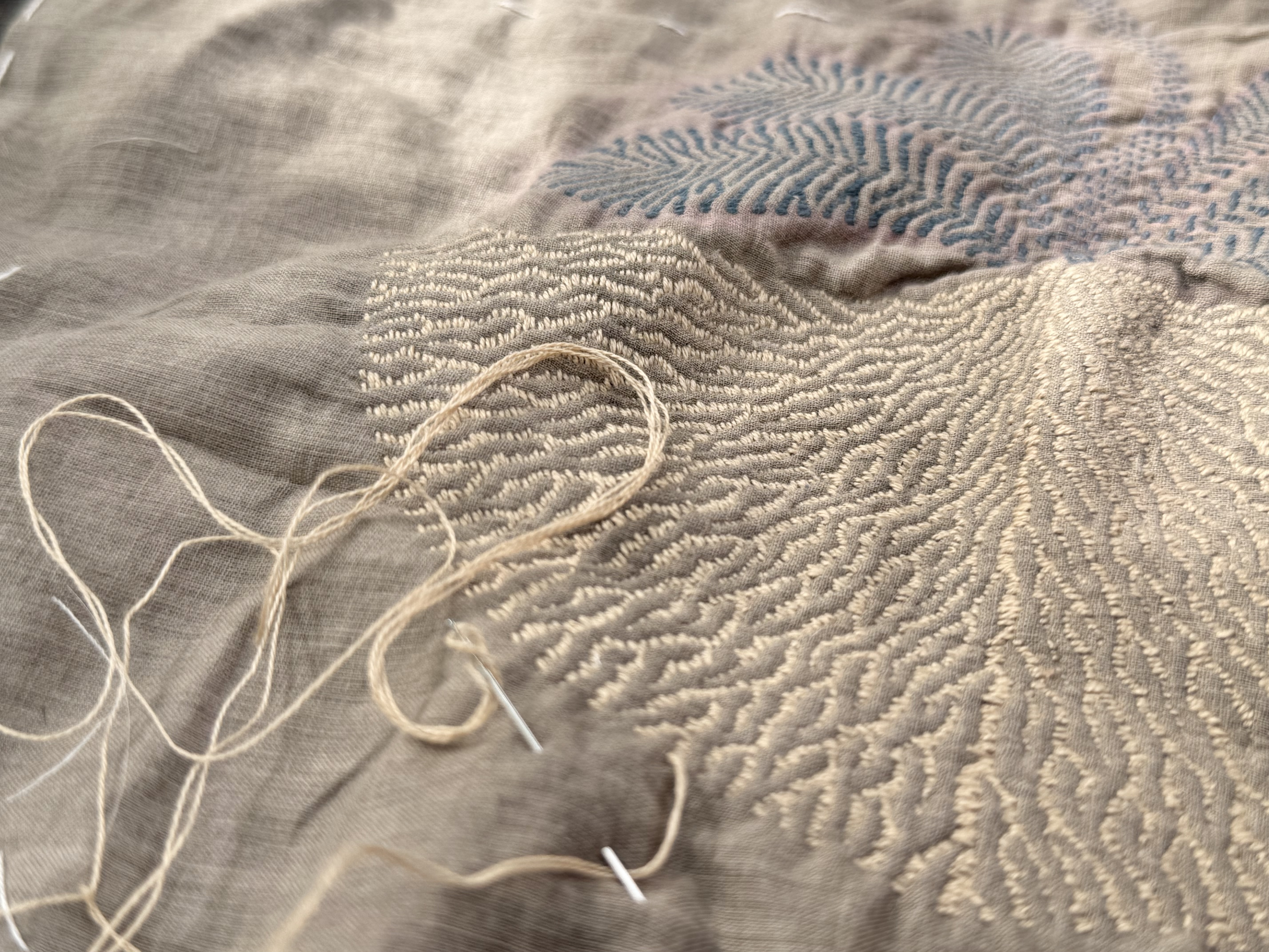 真ん中から縫い始めた模様を途中の段階で望月先生に見せたところ、「『窮屈で息苦しい』『窮屈で見ていて疲れる』『頑張りすぎじゃない?もっと力抜いて楽しんだ方がいいわよ』とボロクソ言われましたが、同時に言い当てられて驚きました」と苦笑します。