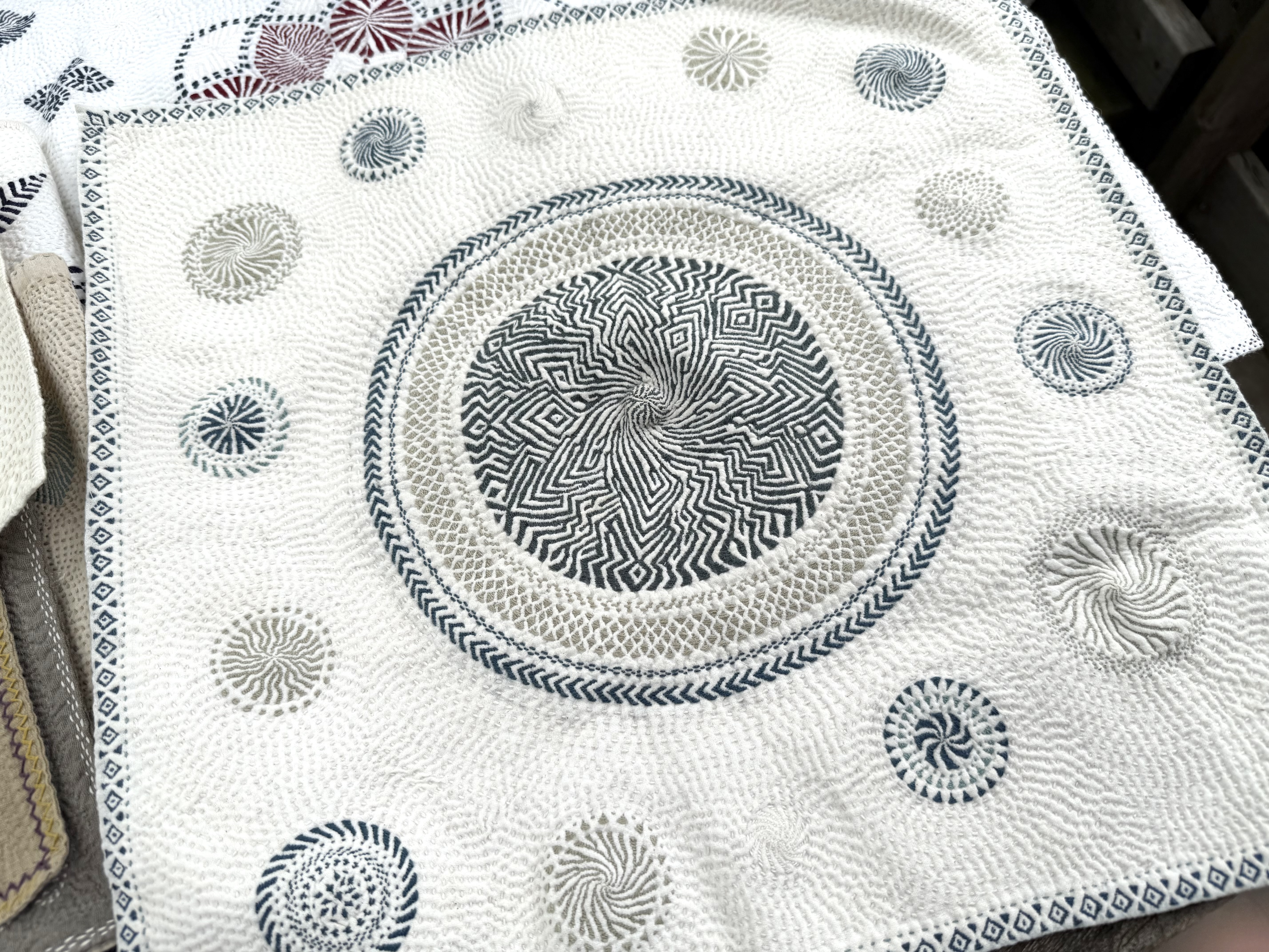「カンタ」とは、インド・バングラデシュにまたがるベンガル地方に古くから伝わる伝統的な刺繍です。もともと家族の幸福と繁栄を祈って作られてきました。 基本的には「並縫い」をひと針ひと針を重ねていき、さまざまな表情を生み出していきます。