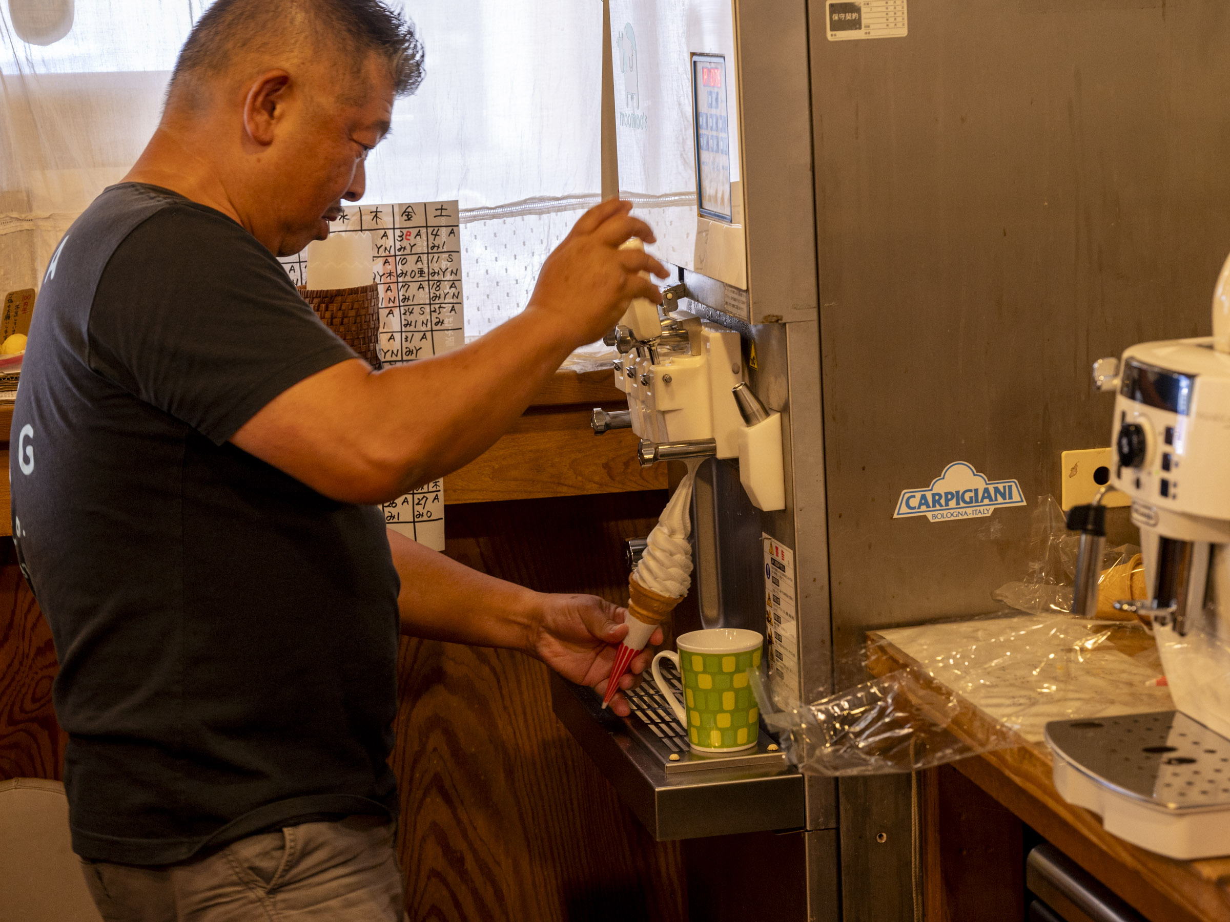 マシンは「カルピジャーニ」という、イタリアのメーカーのソフトクリームサーバーを使用。“ソフトクリーム界のフェラーリ”の異名を持つ、高価で高性能なマシンです。