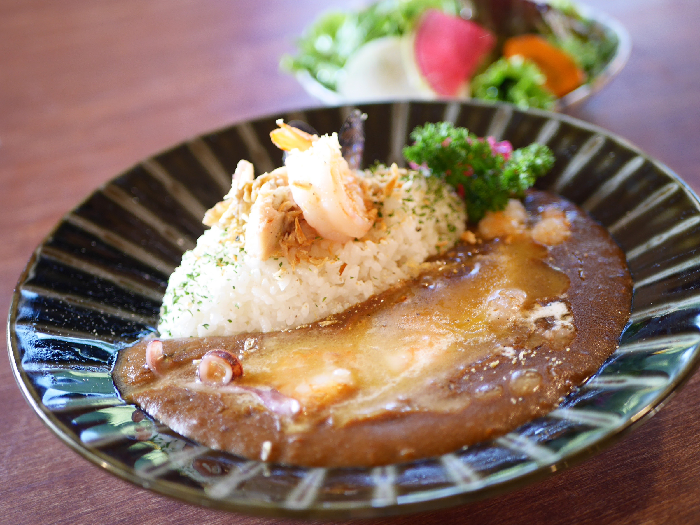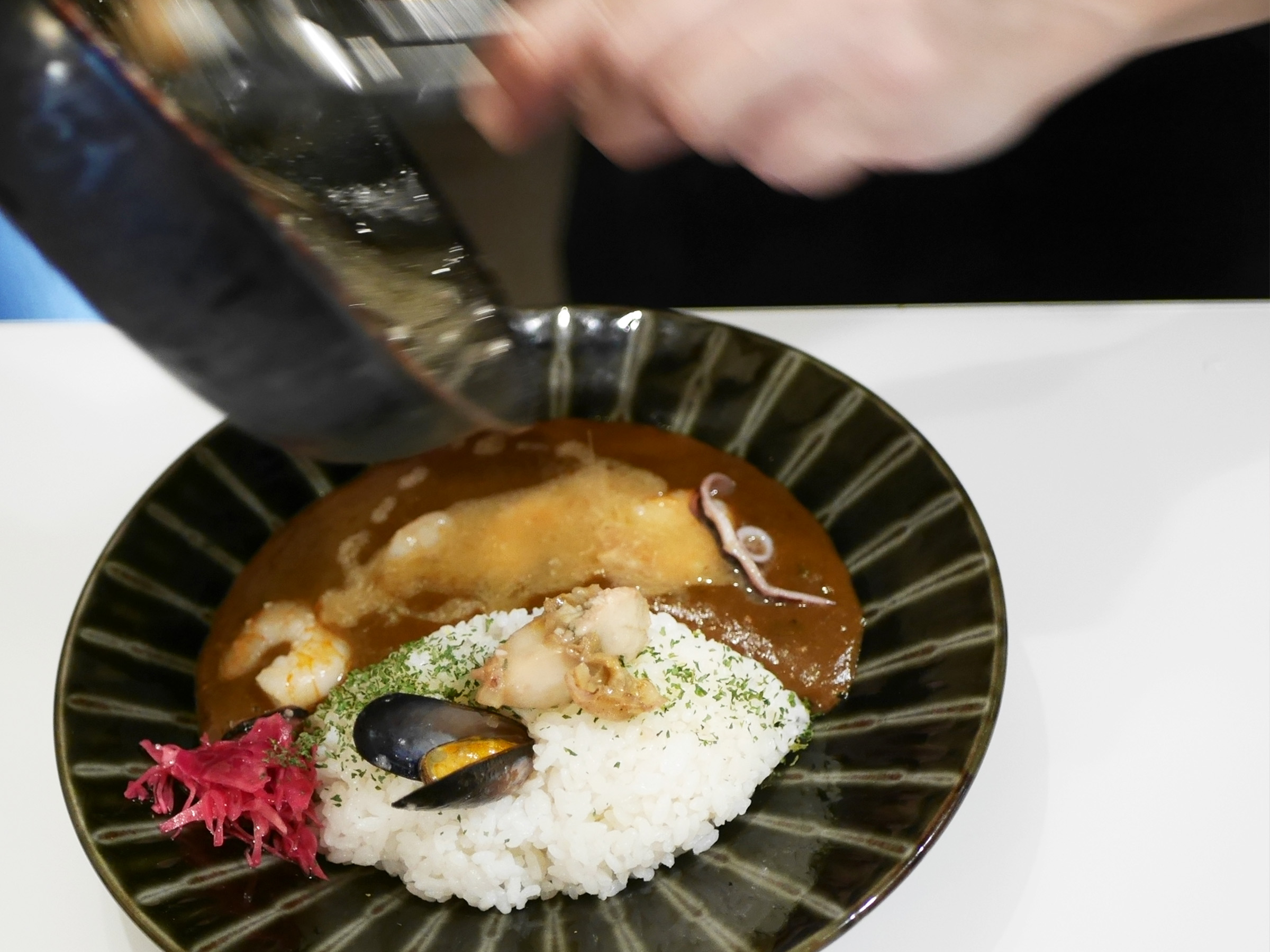 湯気とともに立ちのぼる、スパイスのやさしく芳しい香り。ひと口食べると、ぷりっとした魚の旨みと、ほんのり辛い奥行きのあるカレーソースがじんわりと広がります。