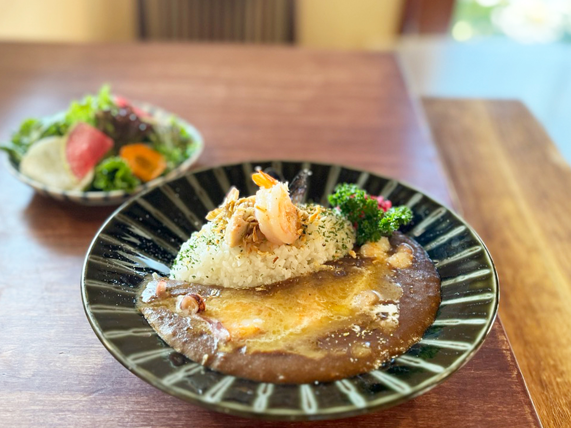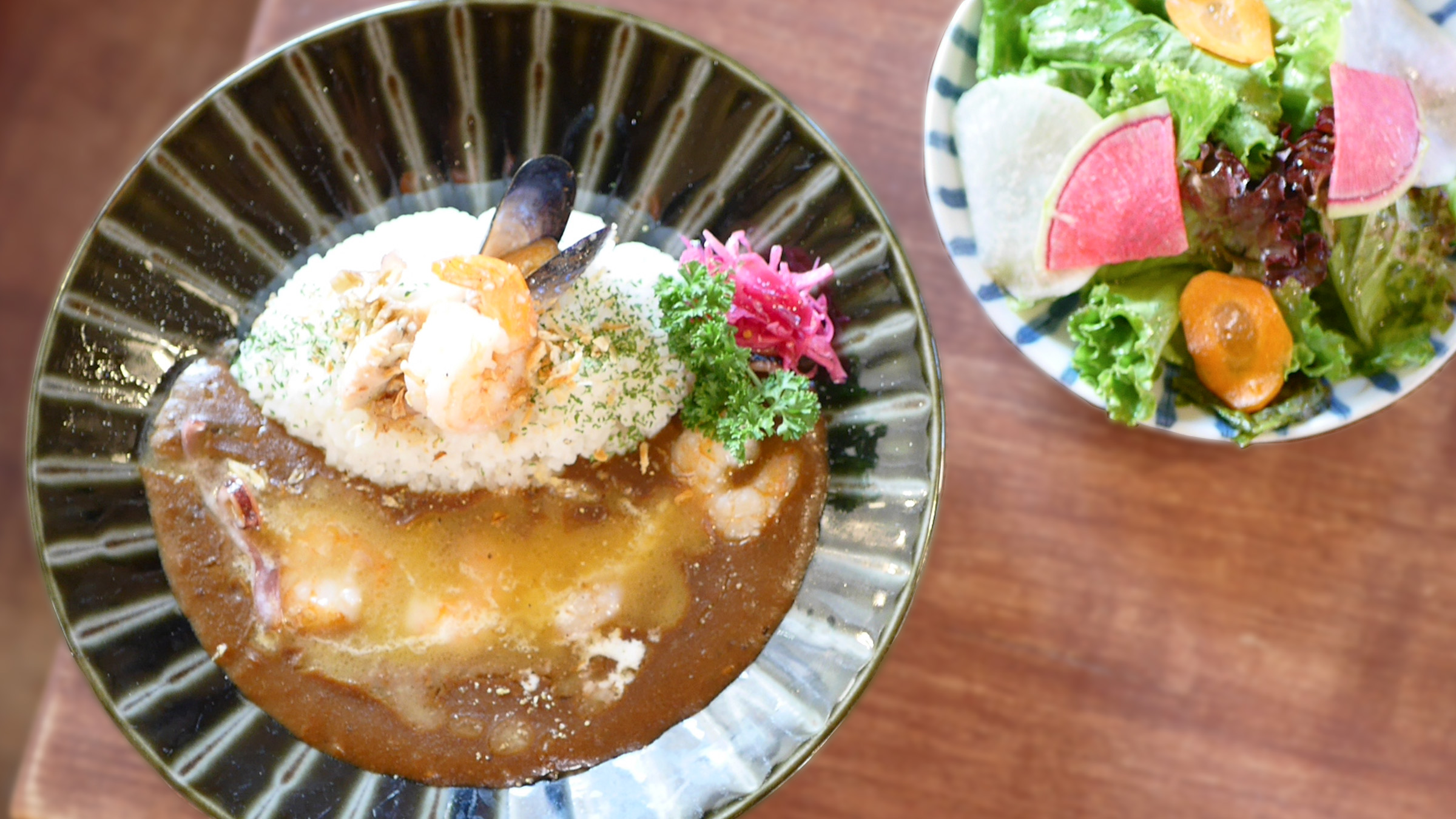看板メニューの一つ「シーフードカレー・サラダドリンク付き(1480円税込)」は、長年研究してきたスパイスをもとに、飴色になるまで炒めた玉ねぎをふんだんに使ったソースが決め手。常連の中には、この一皿を目当てに通う人もいるほどです。
