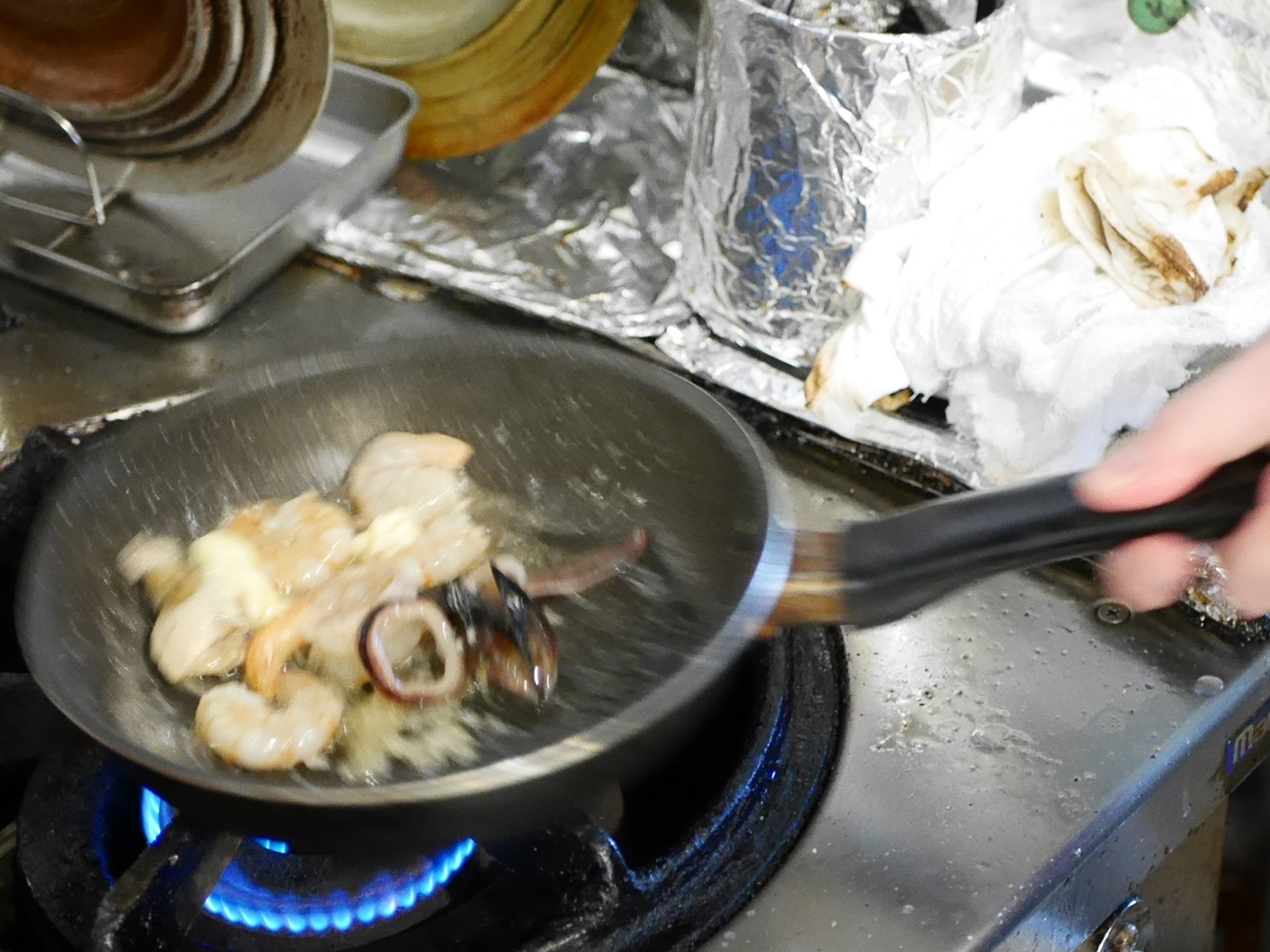 具材には、鮮度の高い二種のエビ、イカ、ホタテ、ムール貝を使用。白ワインとバターで香ばしくソテーされ、魚介の旨みがぎゅっと閉じ込められています。