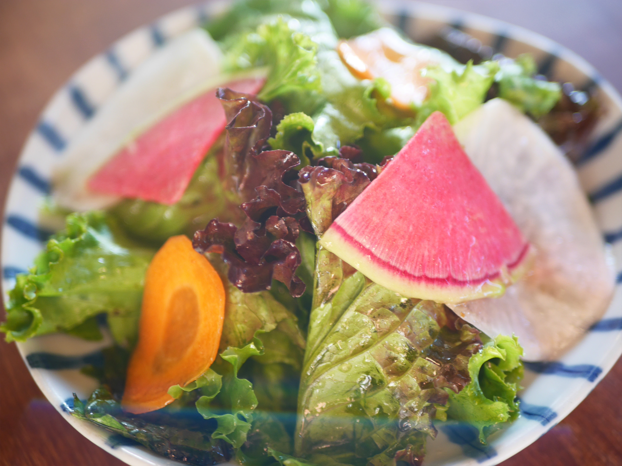 添えられたサラダは、地元・三浦野菜を使用。玉ねぎの甘みを生かした自家製ドレッシングが和えられ、素材の味を引き立てます。