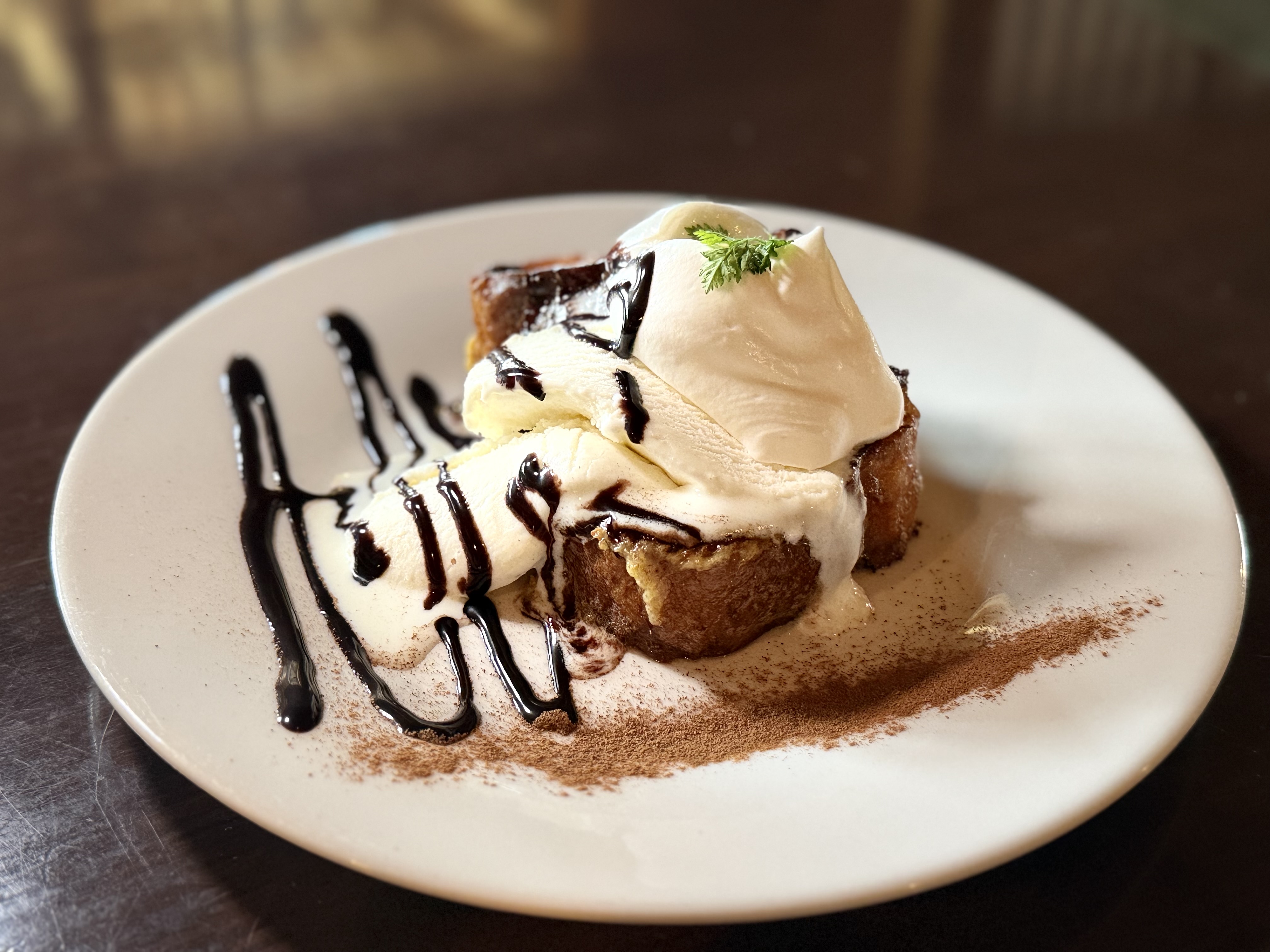 ふっくらと焼き上げられたフレンチトーストの上に、とろりと流れるホイップクリームとアイスクリーム。そこへ艶やかなチョコレートソースがリズムを描くようにかけられ、添えられたハーブが軽やかなアクセントを添えています。