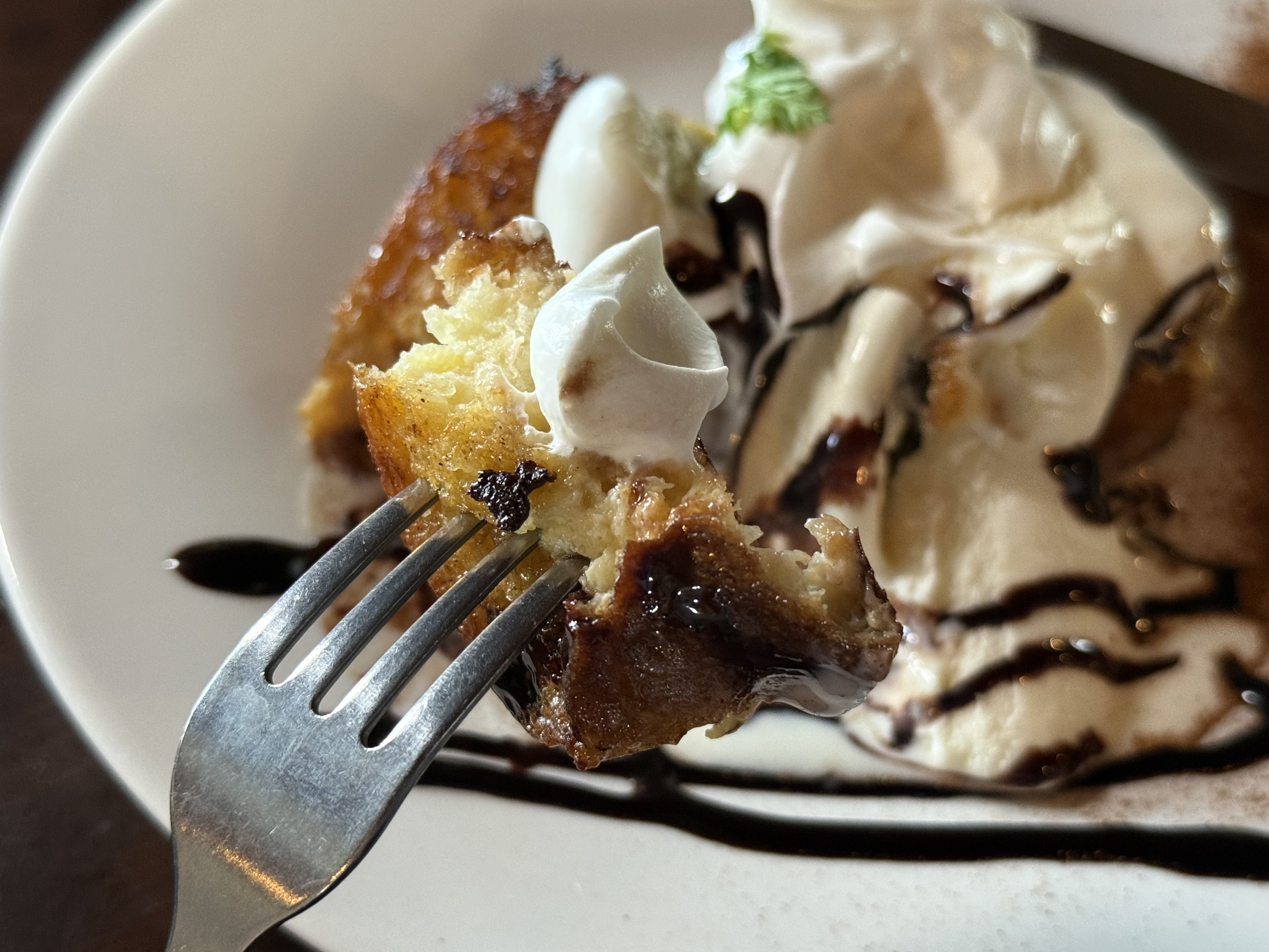 フォークをそっと落とした瞬間、生地はふわりとほどけ、内側からは“しっとりとした柔らかさ”が姿を見せます。 外側には淡いサクッと感が残り、内側は瑞々しさを感じるほどしっとり。 表面は薄くキャラメリゼされ、ほのかな香ばしさを纏いながら、ひと口頬張れば中はもちもちと弾むような食感。 特にバゲットの耳のサクサクとした歯触りは、思わず息をのむほど軽やか。