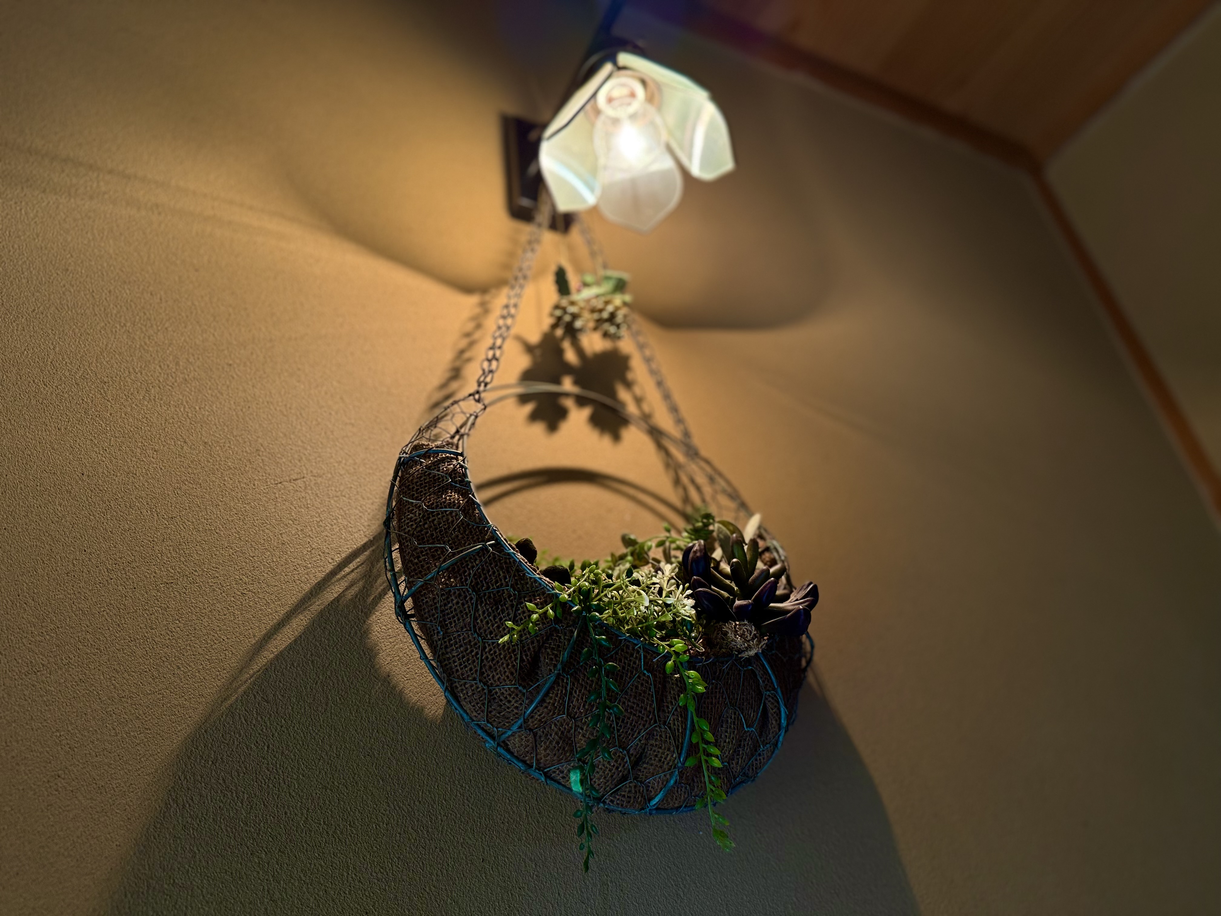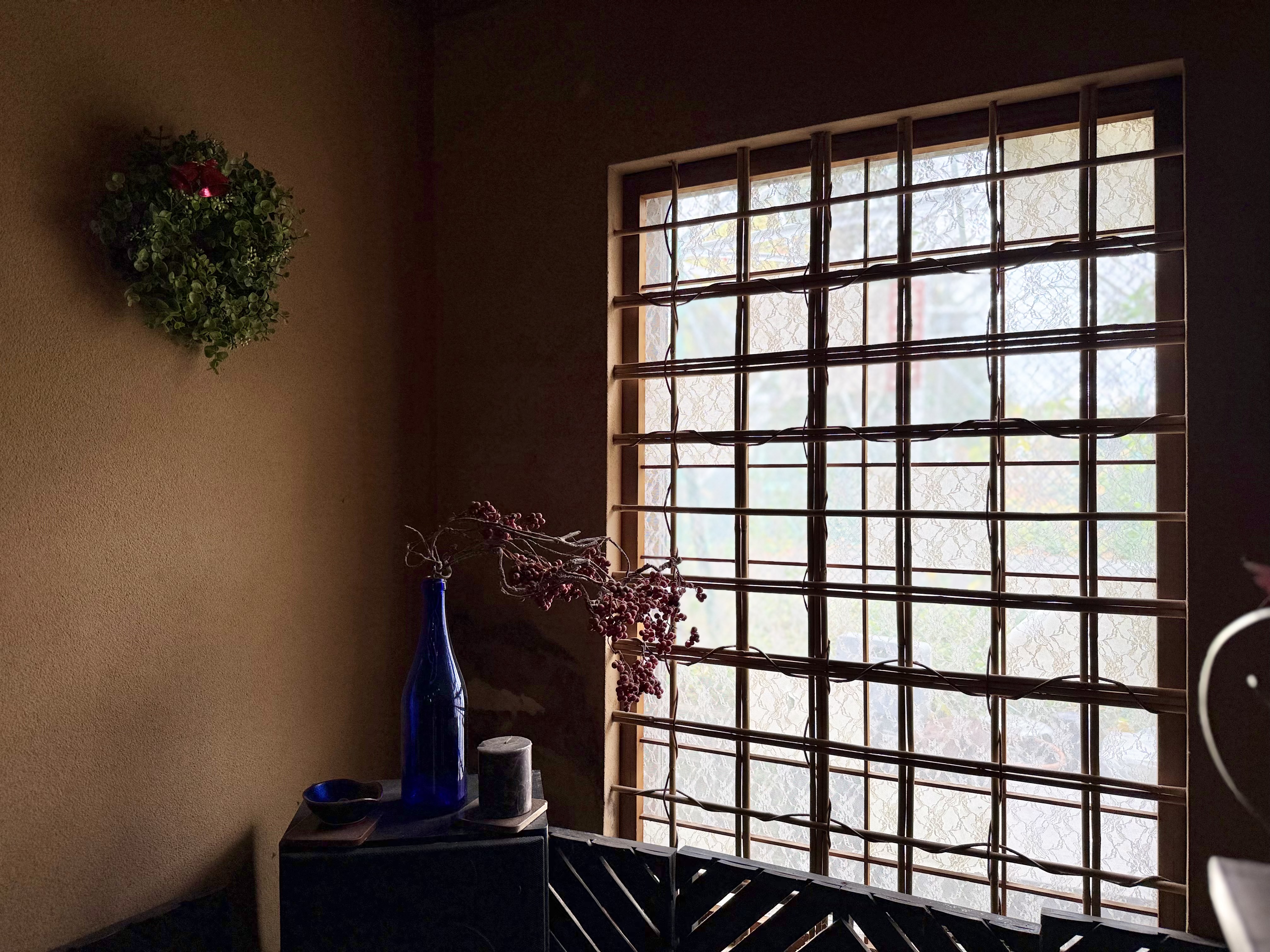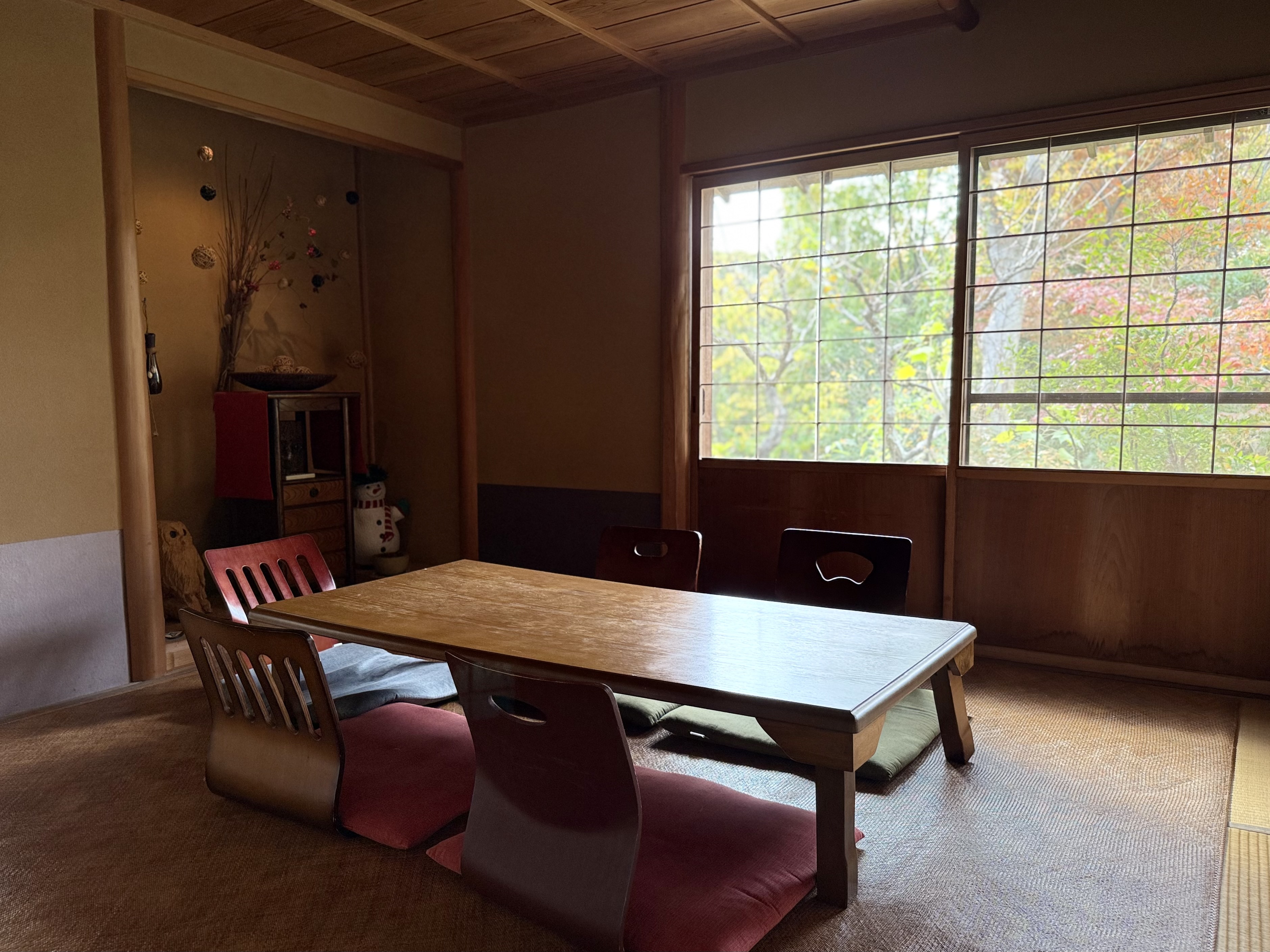 木組みの天井、やわらかな灯り、アンティークの椅子と小さな“山の上の茶室”のような空間が広がります。季節の木々がそっと窓辺を彩り、和室には静けさとやさしい気配が満ちています。