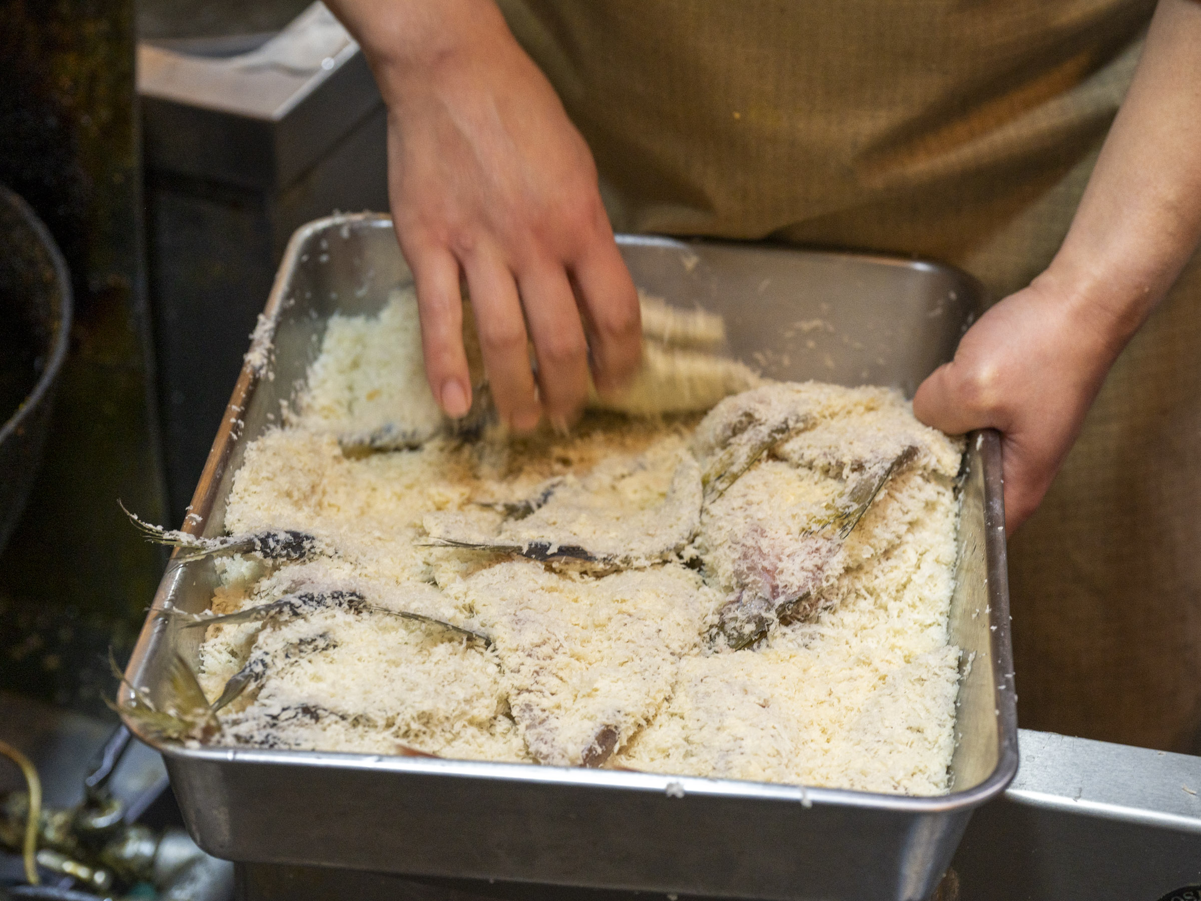 逗子マリーナからすぐの「和食 魚佐次」。創業時からの看板メニュー「アジフライ定食」(1,050円)を提供し続けて約40年。今も受け継がれる大きな鍋で、丁寧に揚げられています。